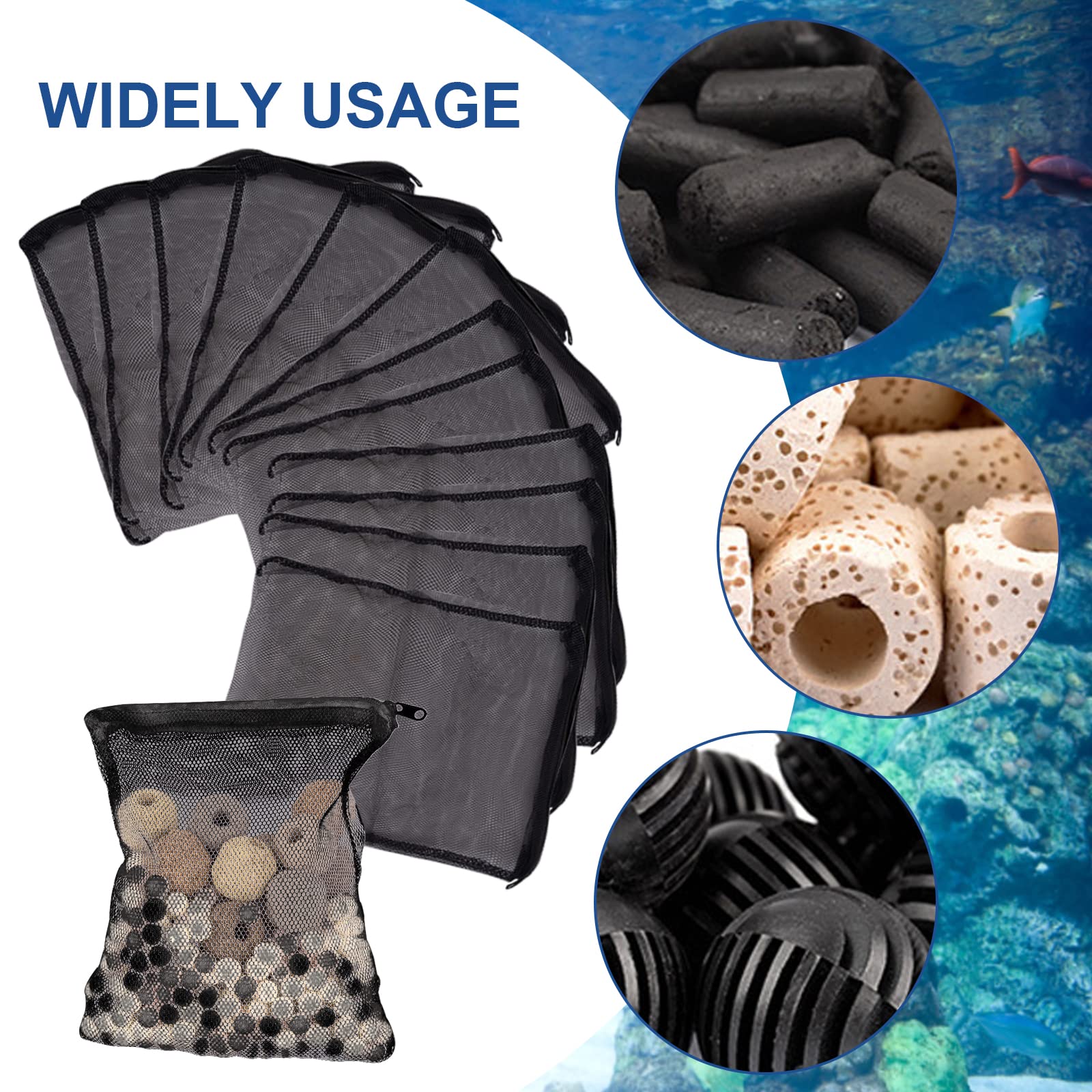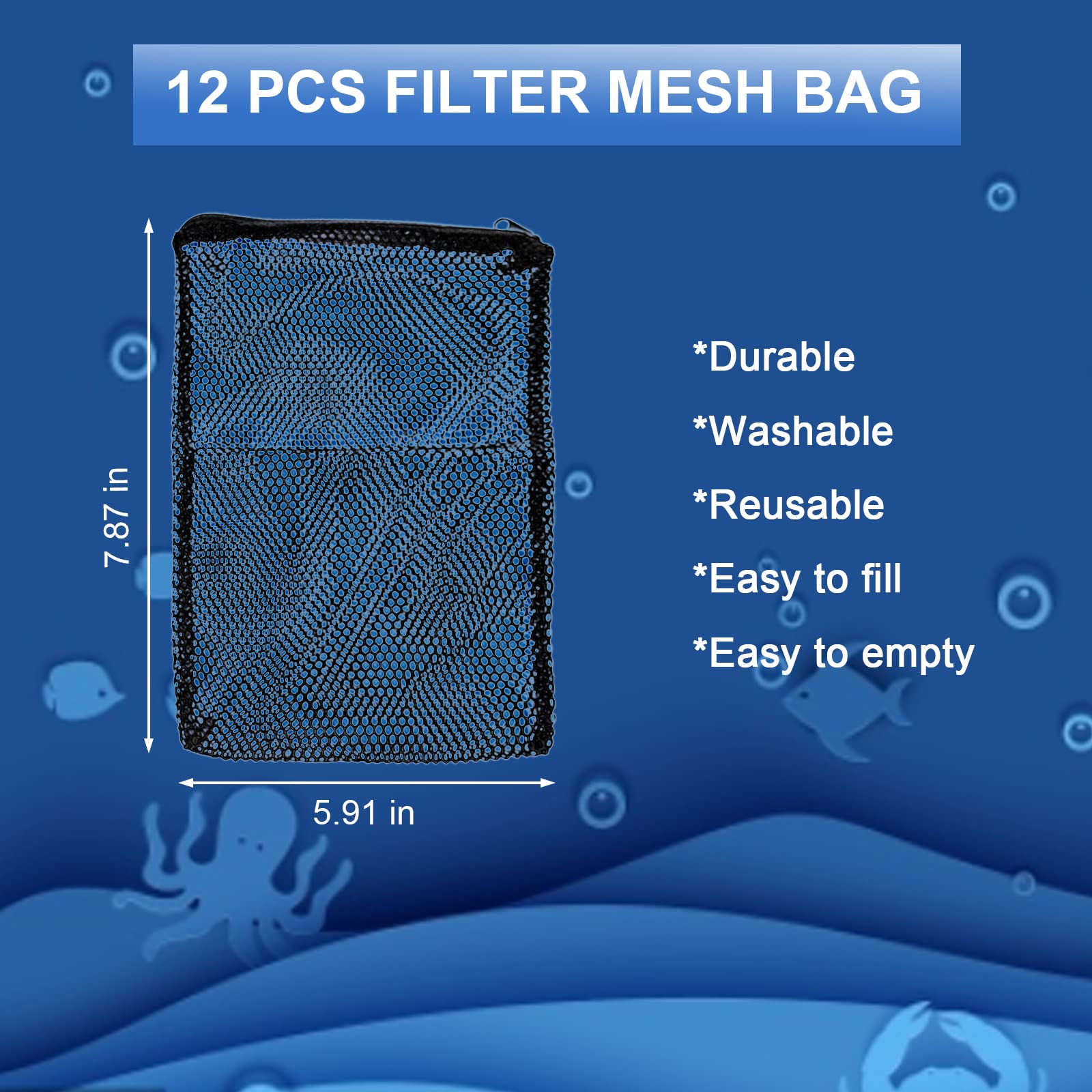 SUFFICIENT QUANTITY -- The package contains 12 pieces aquarium filter media bags in black color in about 5.91*7.87 inches, the mesh diameter is about 0.2mm-0.4mm, which is suitable for most fish tank filter materials without spilling.
