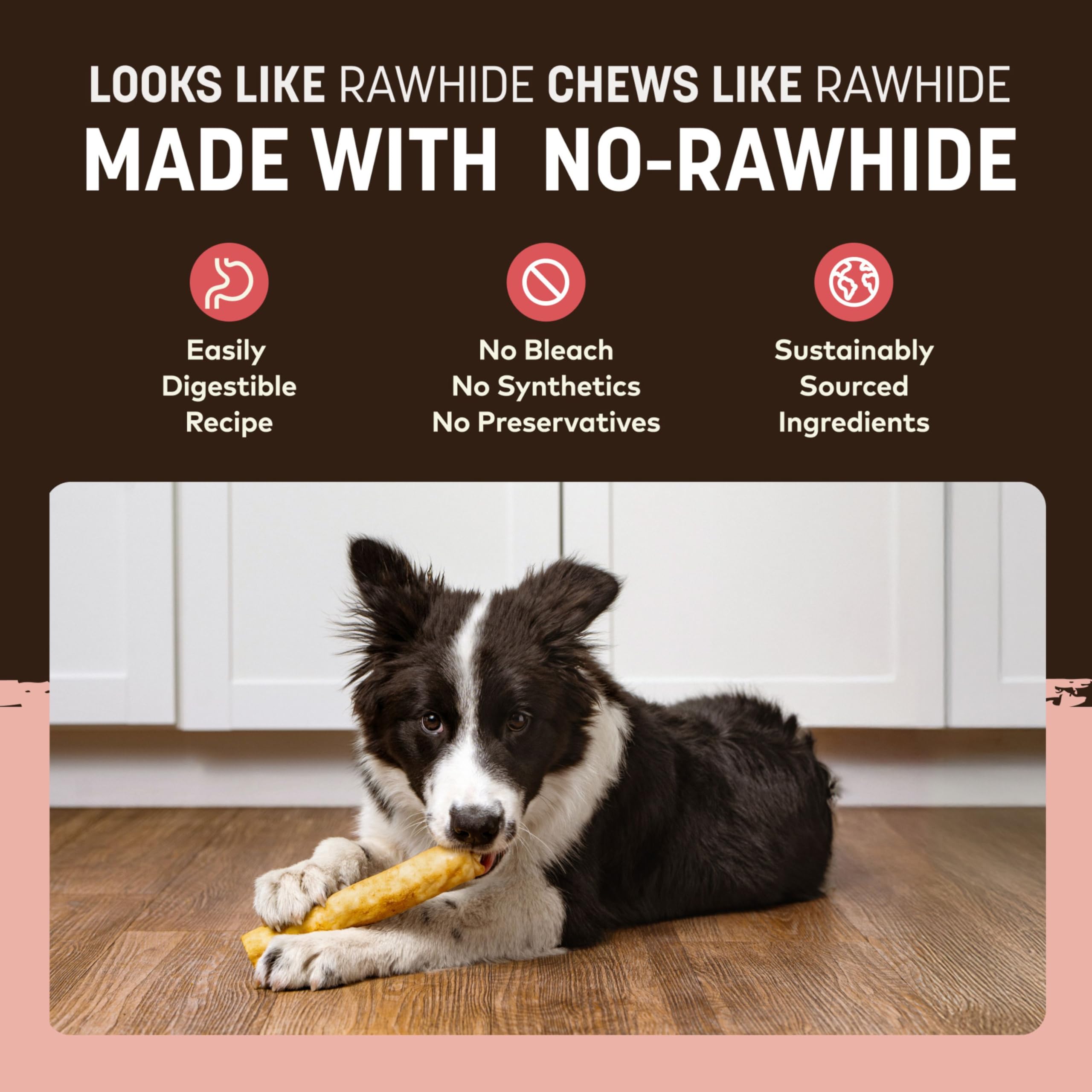 MADE WITHOUT: No bleach. No synthetics. No foul odor. Each No-Hide starts with simple ingredients: brown rice flour, agar-agar, eggs, olive oil, banana powder, & pineapple stem. After adding a juicy, fruity natural flavor, they're baked to perfection