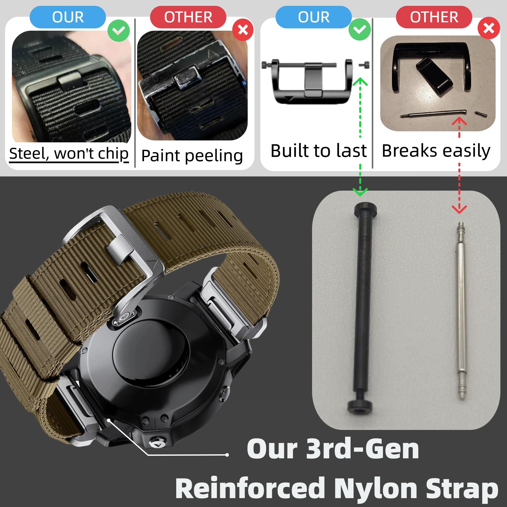【26mm Watch Bands Compatible with Garmin 51mm Watches】This quickfit 26mm watch band is designed for Garmin Fenix 8 51mm (AMOLED/SOLAR), epix Pro 51mm (NOT included 42mm/47mm), Instinct 2X, Fenix 7X Sapphire Solar / Fenix 7X Solar, Tactix 7 Pro, Fenix 6X Pro / Fenix 6X Sapphire Solar, Fenix 5X /5X Plus, Fenix 3/Fenix 3 HR, --D2 Charlie/D2 Delta PX, --Enduro / Enduro 2, --Descent Mk1 / Descent Mk2i / Mk2 , --Tactix Delta / Charlie / Bravo, Quatix 3.