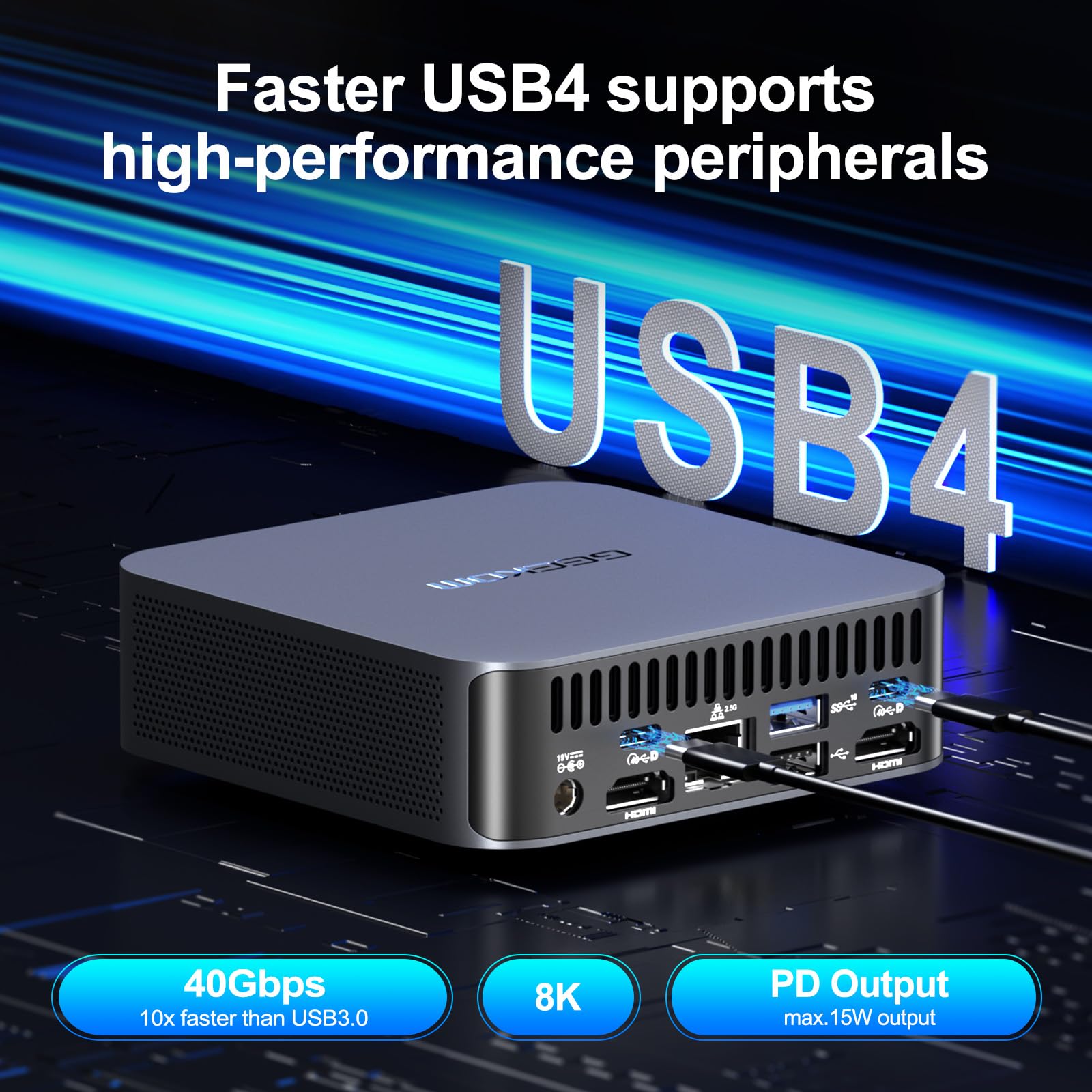 All set before you - The mini desktop computers supports up to four 4K displays via 2 USB4 Type-C and 2 HDMI ports, when users perform video editing, graphic design and multi-tasking operations, there is no need to switch between multiple software and tasks, providing content creators with a wide working space, all at once.