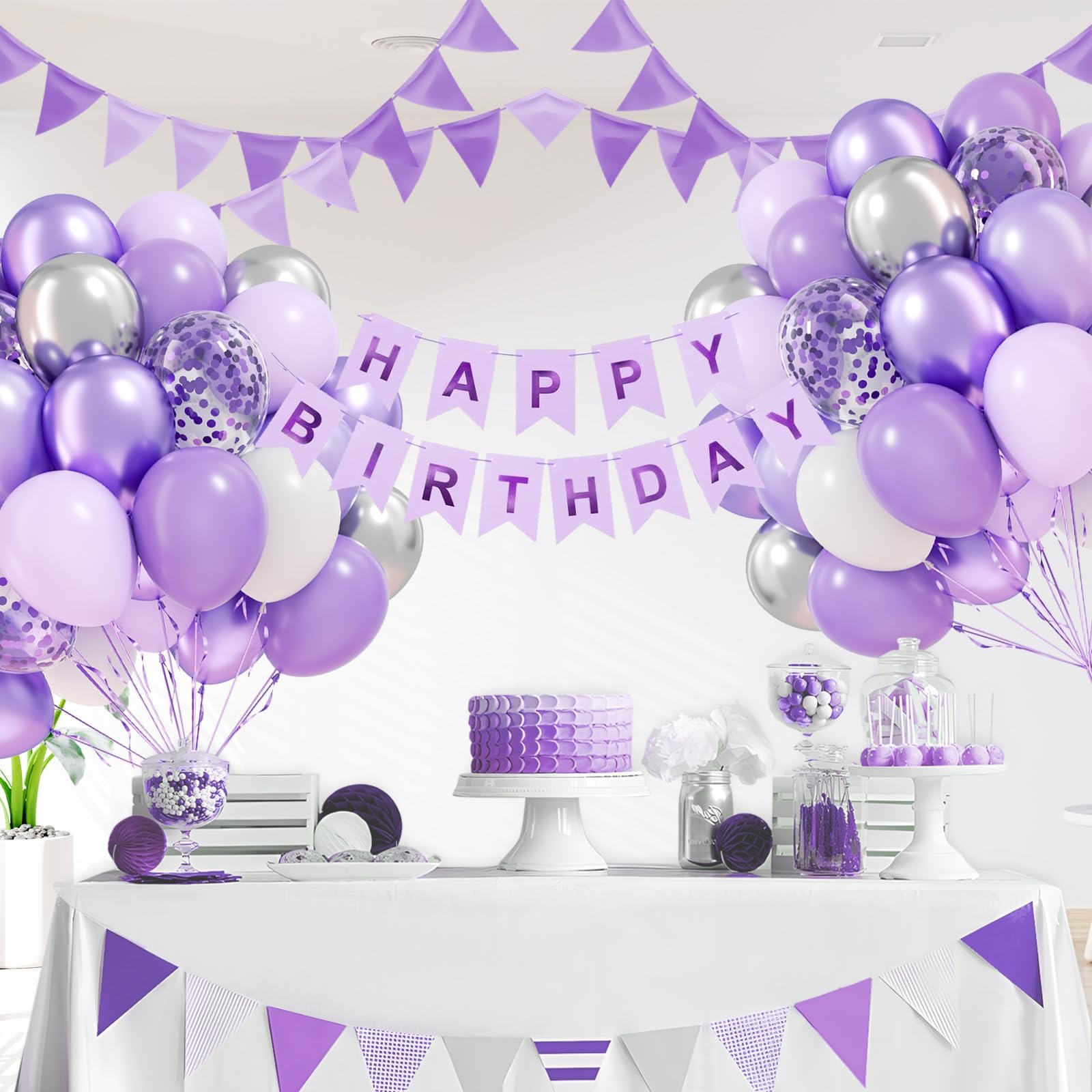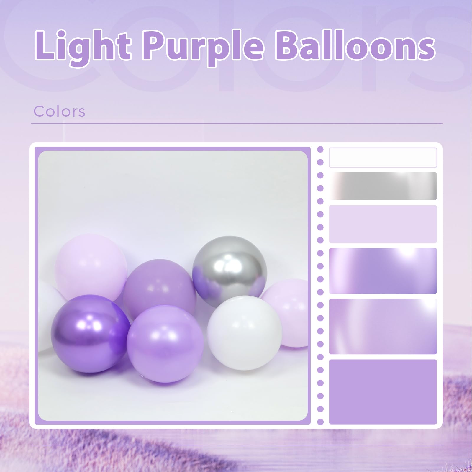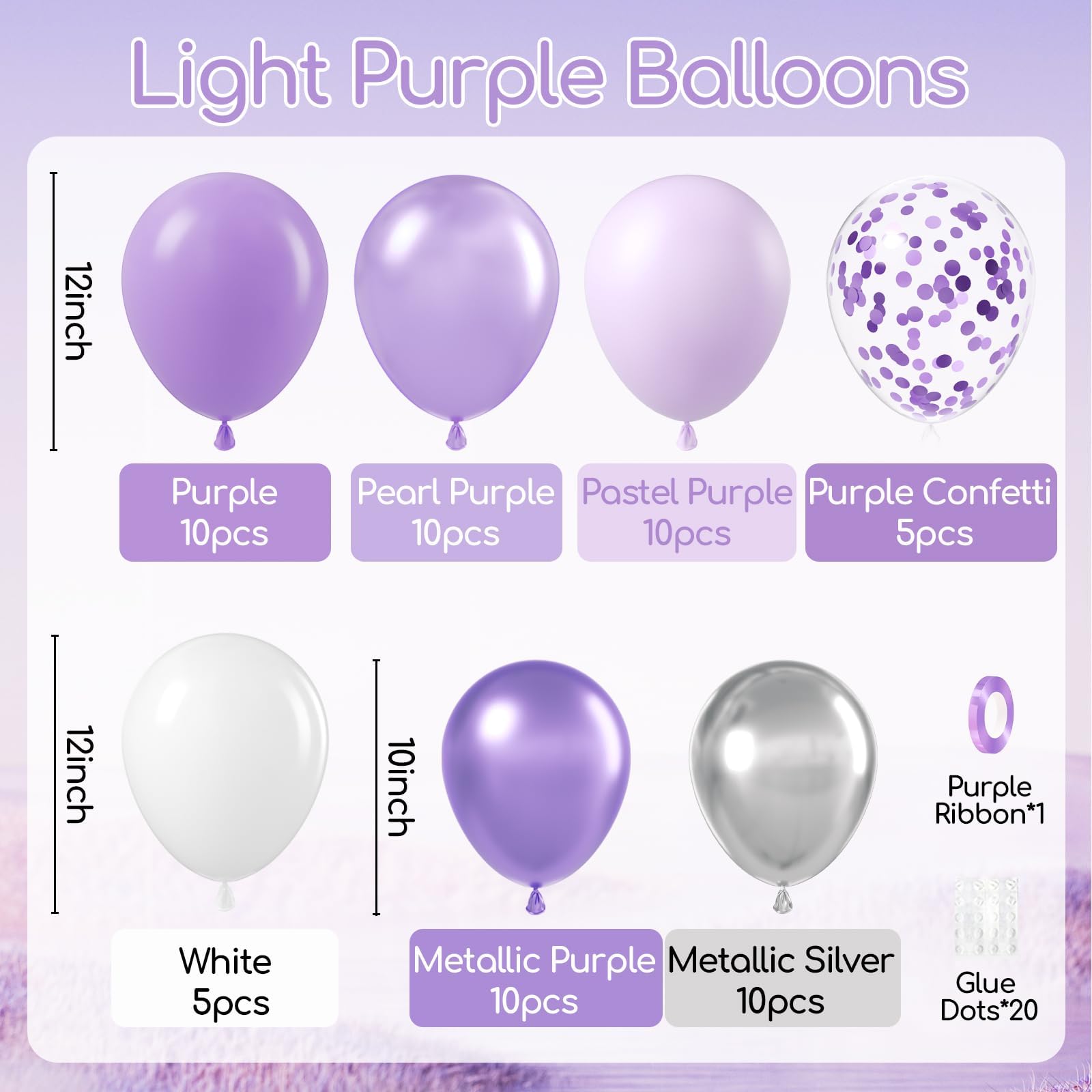 Package Include: The purple and silver balloons include 12inch purple balloonsx10, 12inch pastel purple balloonsx10, 12inch pearl purple balloonsx10, 12inch purple confetti balloonsx5, 12inch white balloonsx5, 10inch metallic purple balloonsx10, 10inch metallic silver balloonsx10, glue dotsx20, purple ribbonx1