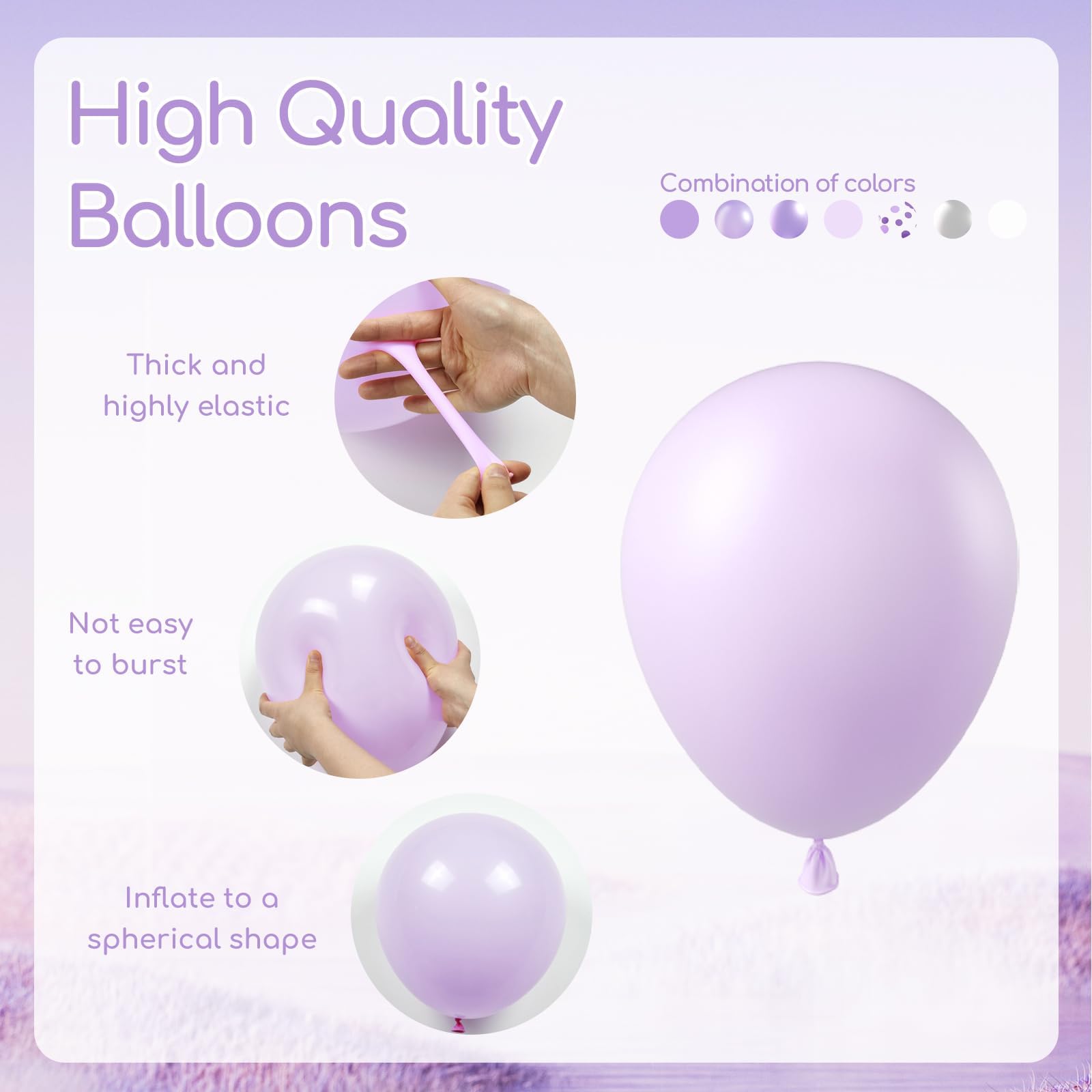 Good Balloons: The lavender balloons are made of good quality latex that is easy to inflate and secure for people to use. It can be filled with air and helium. It is recommended to inflate with a balloon pump, but do not over inflate to ensure a excellent shape
