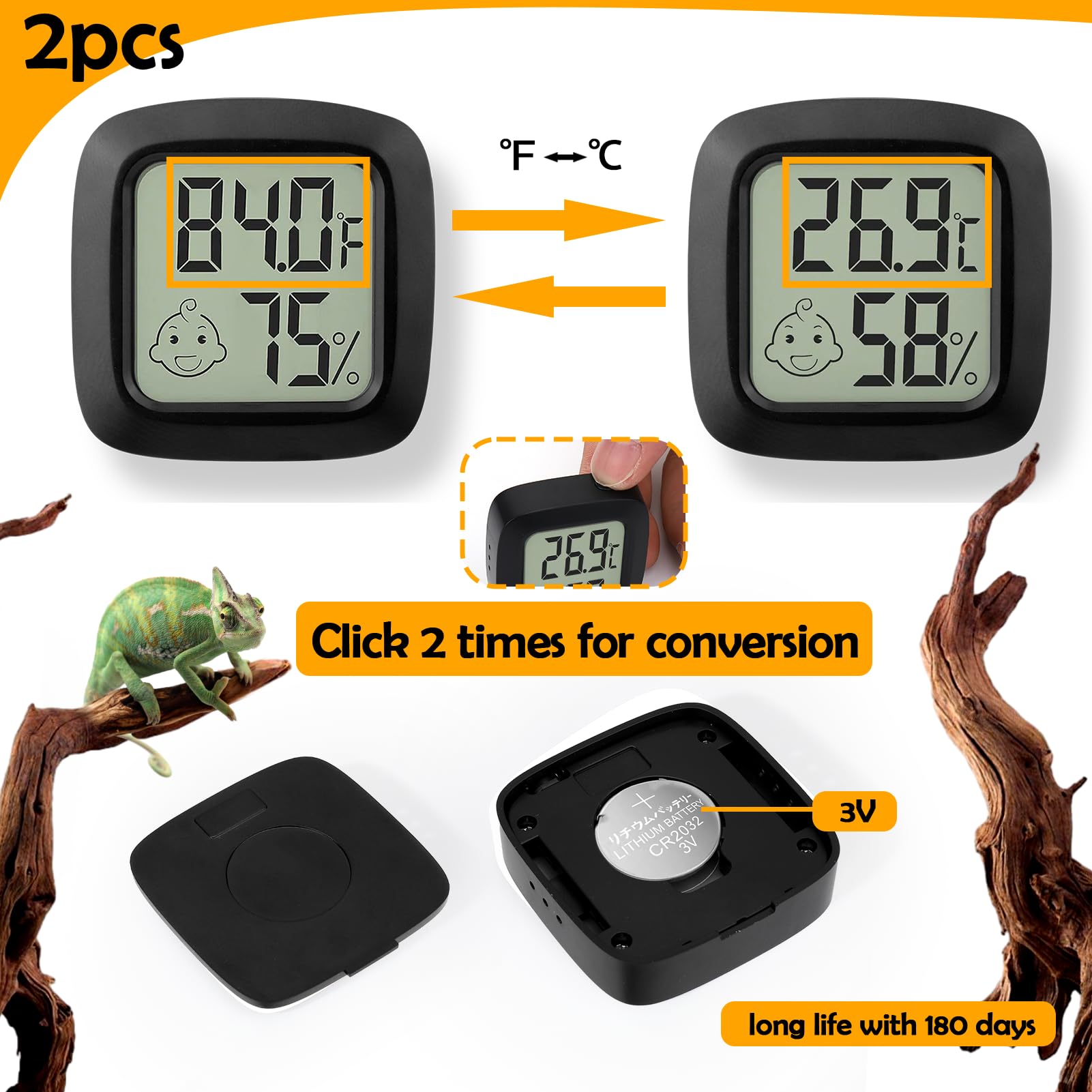 Package Included: You will receive 2pcs reptile tank thermometers, set in button cell with 3V, keeping long life with 180 days. Thermometer range from -4°F to +140°F(±1°F), humidity range from 10% to 99% RH(±5%).