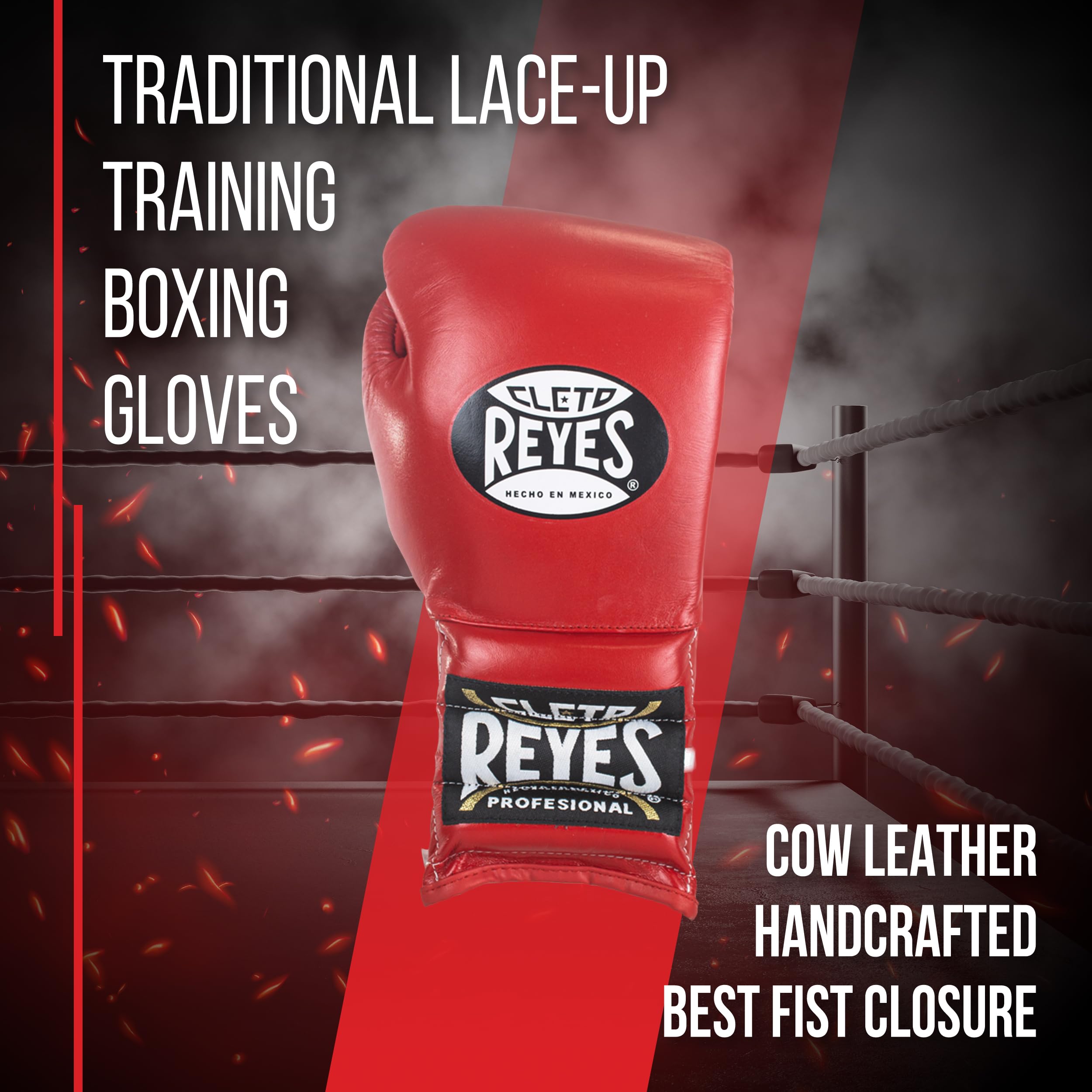TRADITIONAL LACE UP TRAINING BOXING GLOVES - CLETO REYES heavy-duty boxing gloves are handcrafted in Mexico from COW LEATHER, anatomically designed with a form-fitting curved knuckle area for better fist closure.