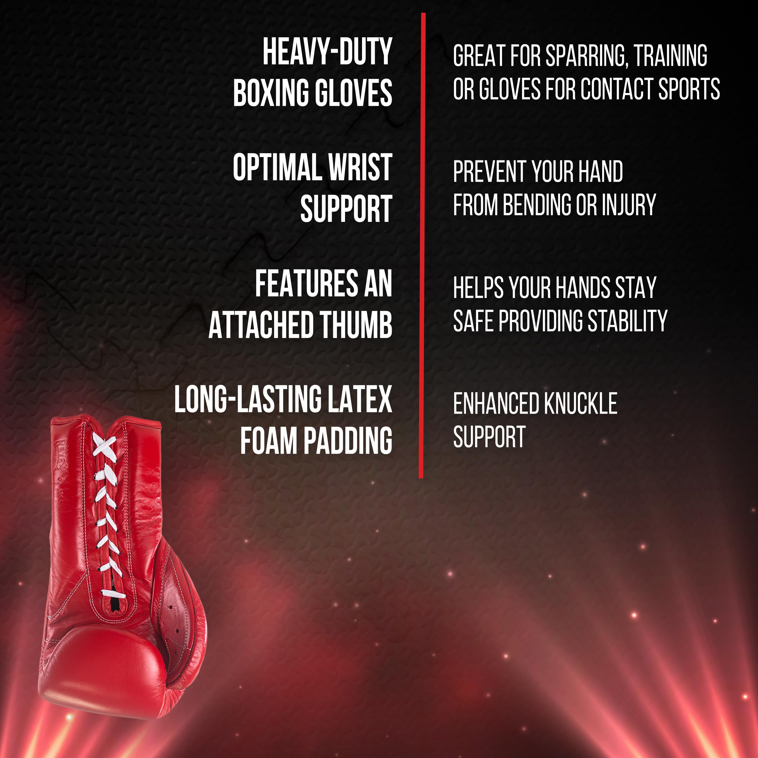 HIGH-QUALITY MATERIALS - Boxing sparring gloves with a traditional lace up closure and long-lasting latex foam padding for enhanced knuckle support. The boxing training gloves feature an attached thumb that helps your hands stay safe providing stability and helping your thumbs to stay intact while training.