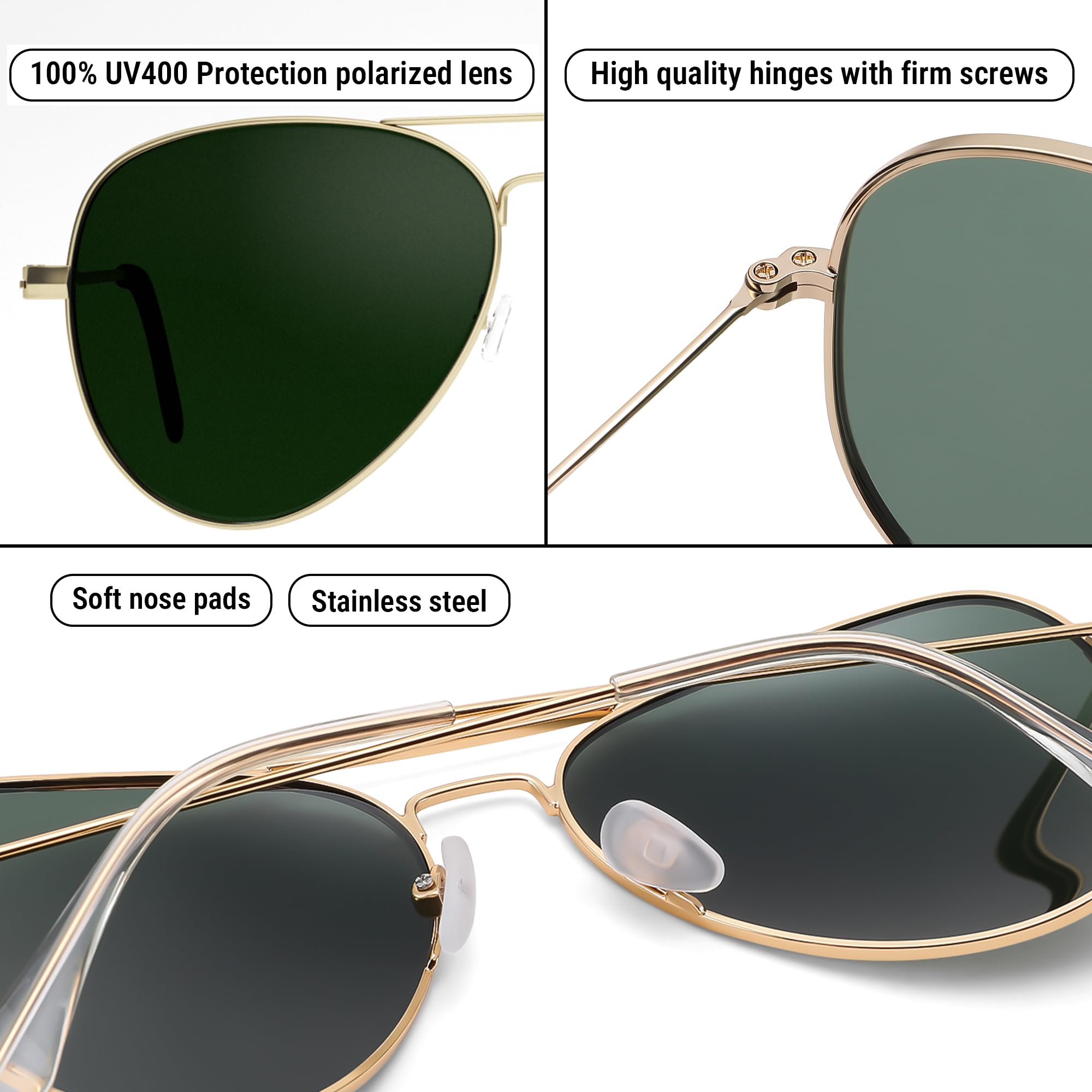 Polarized Protection: During outdoor activities, high-quality polarized glasses provide 99.9% UV400 protection and efficiently decrease glare. The classic aviator sunglasses are suitable for driving, cycling, fishing, and outdoor activities