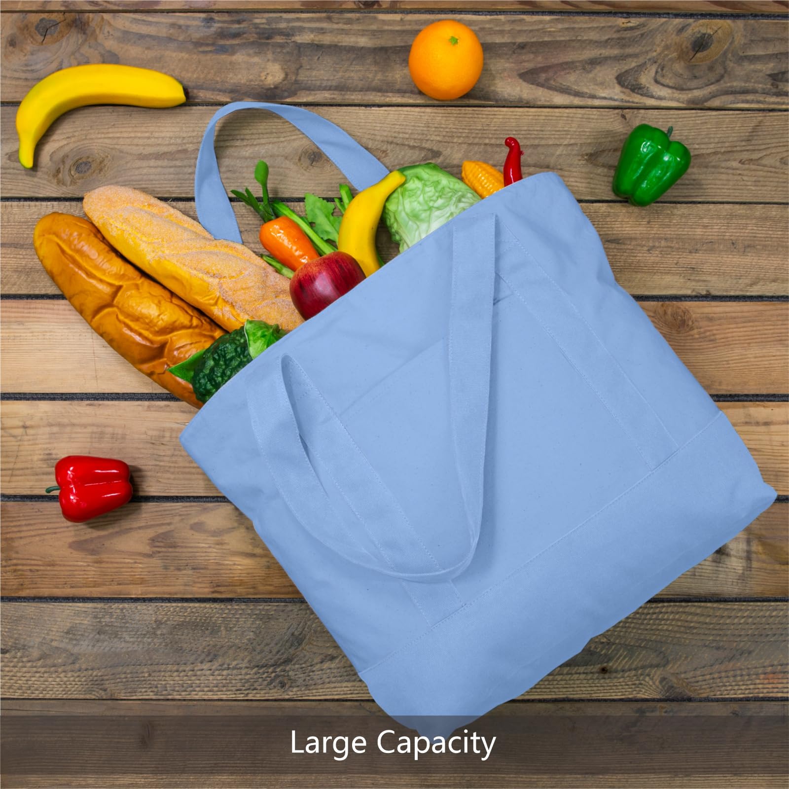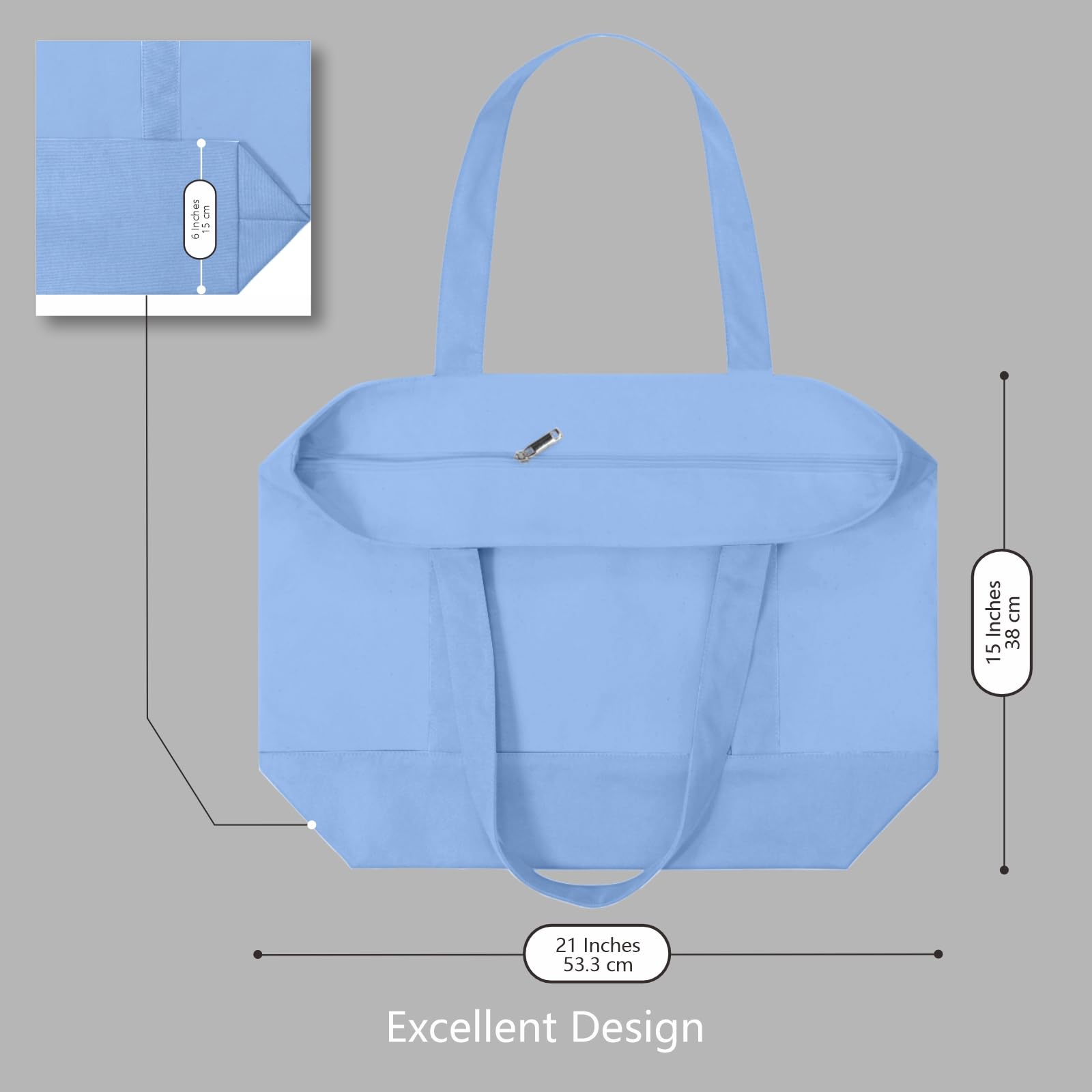 LARGE CAPACITY & DURABILITY: the size is 21" x 15" x 6" and it is made of heavy duty 100% 12oz cotton canvas with 8" x 8" outside pocket for carrying small items. Further, the top zipper closure makes your goods safer. Its handle is 1.5" W x 25" L, which is easy to carry or slung over a shoulder. The bags are made with dense thread and exquisite workmanship. All seams are reinforced and sewn to ensure their durability.