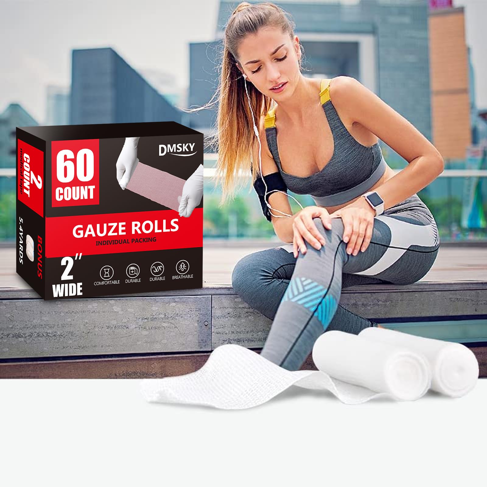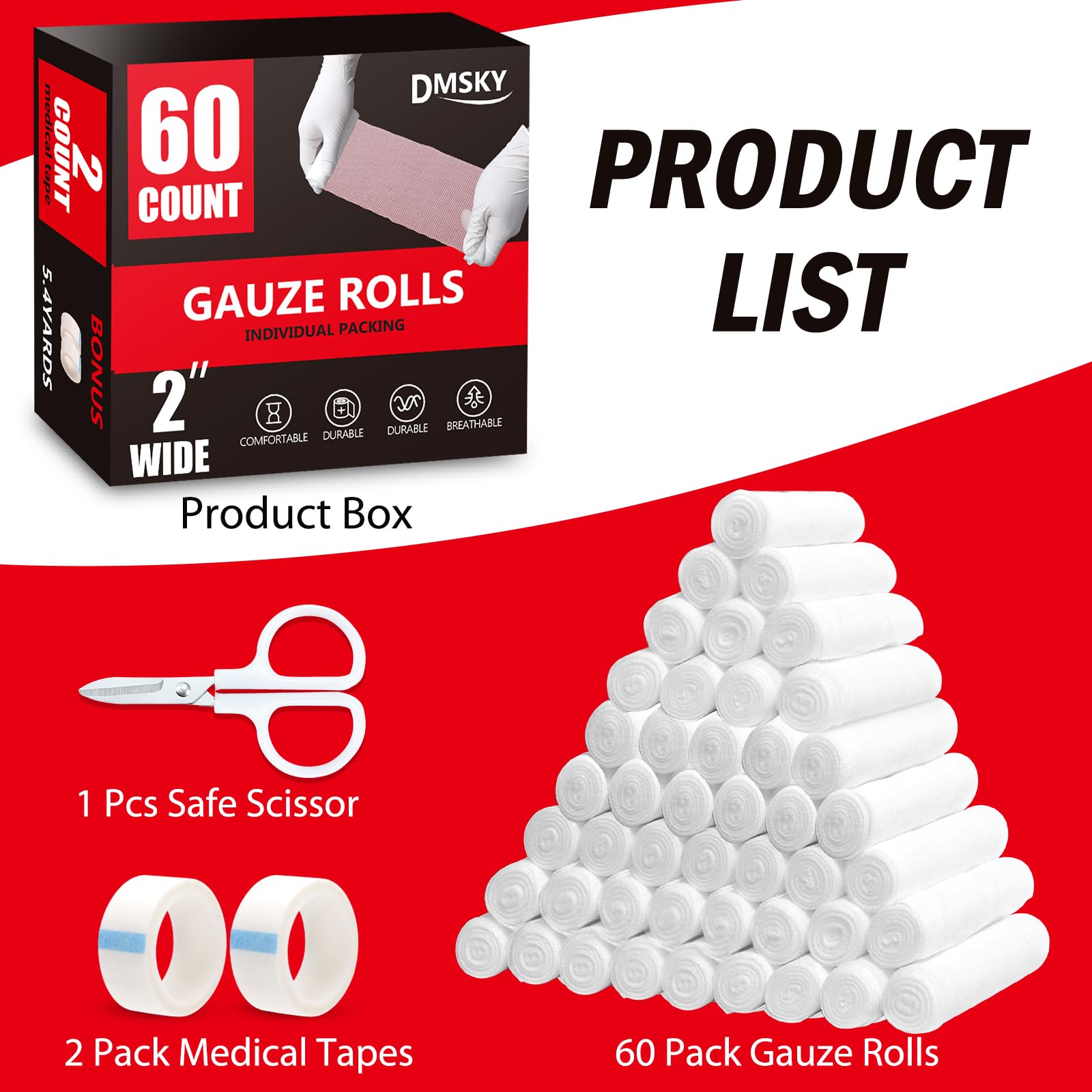 ✅【Individually Packed】60 pack individually wrapped gauze rolls with 2 medical tapes is the first choice for your first aid kit! Each roll is 2 inches x 4.1 yards, you can cut it according to your needs. This is a good supplement to your first aid kit, hospitals, schools and sports.