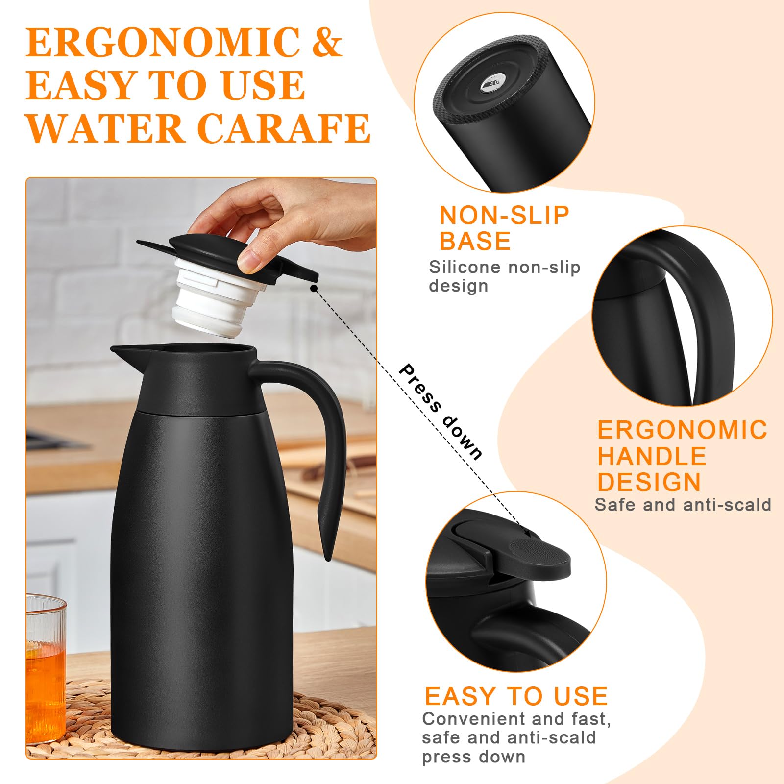 Use with Ease: the double walled hot water carafe is thoughtfully designed with a bent handle, easy and comfortable to grip and hold, and they are not easy to leak, you can just push the button to open the pour spout, making it a breeze to pour with single hand