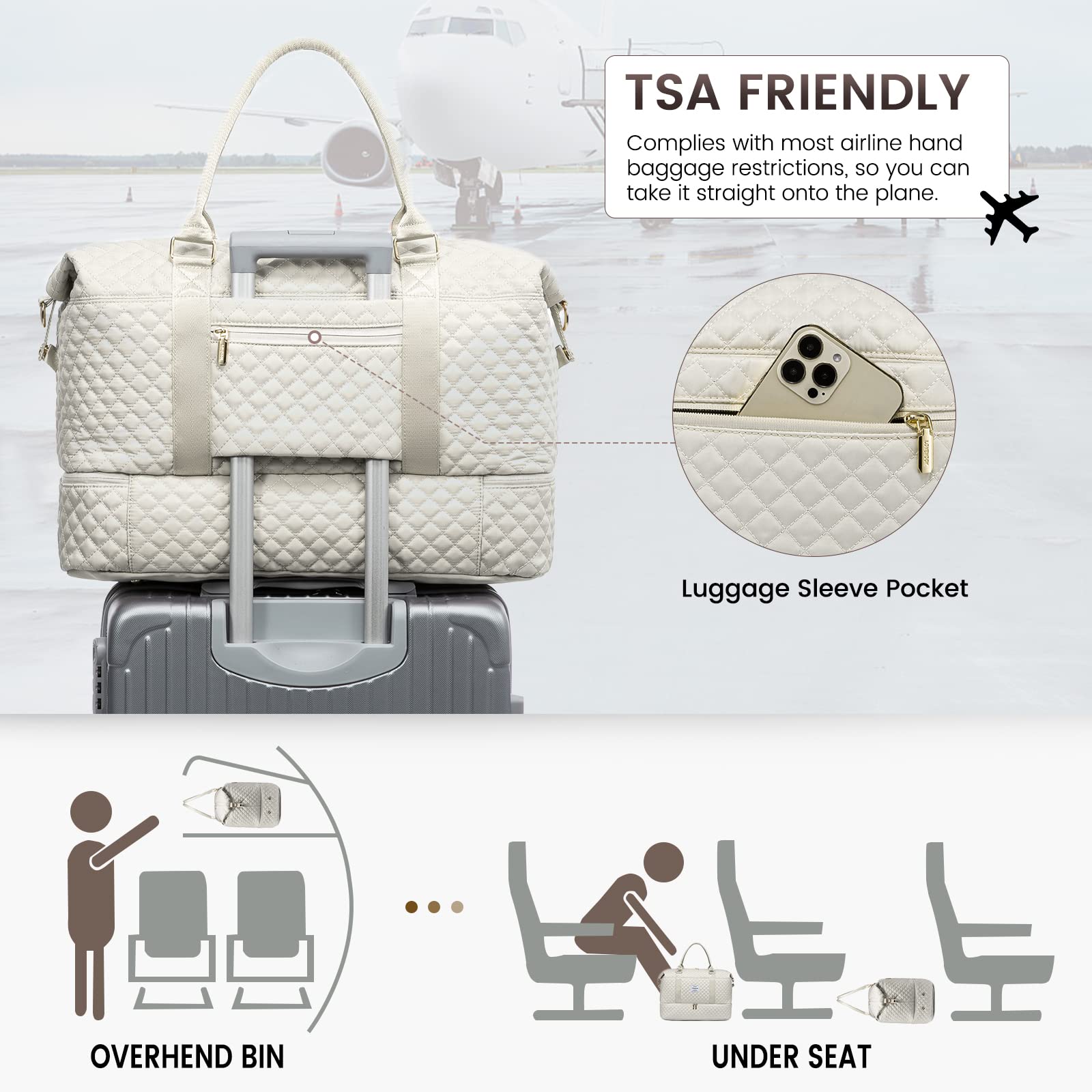 【STYLISH WEEKEND BAG & OVERNIGHT BAGS FOR WOMEN】This large duffle bag can even fit in 3-5 days of daily essentials. Multiple pockets to keep your personal items organized: a spacious main compartment with 5 big pockets for personal items and in the front of the duffle bag for travel, there is a pocket for easy access electronics or travel materials. Featuring with classy and gorgeous appearance. Our quilted duffle bag reach morden urban ladies greatest demand and fantasy on travel bag.