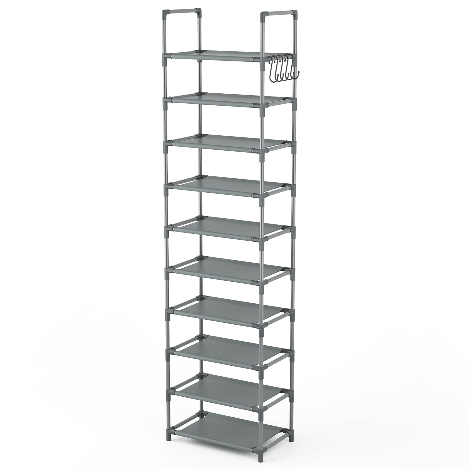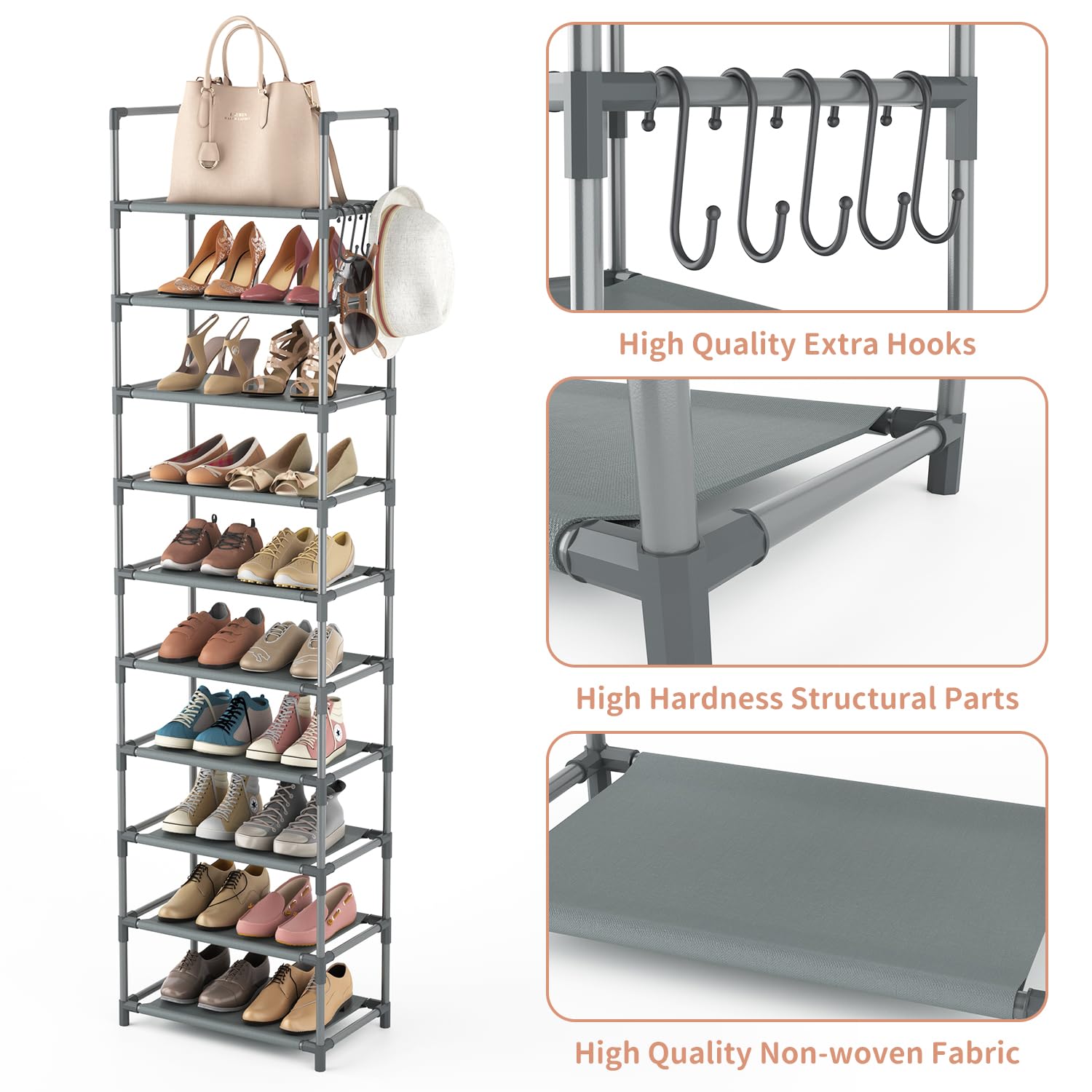【Large Capacity 10 Tier Narrow Shoe Rack】The 10 tier shoe organizer can store up to 20-25 pairs of adult shoes, and you can remove one layer to fit long boots. This shoe organizer is not only suitable for shoes, but also for bags, toys, towels, sundries, books, plants and small accessories. Shoe storage with 5 hooks, you can hang keys, umbrellas, bags, etc., very practical design.