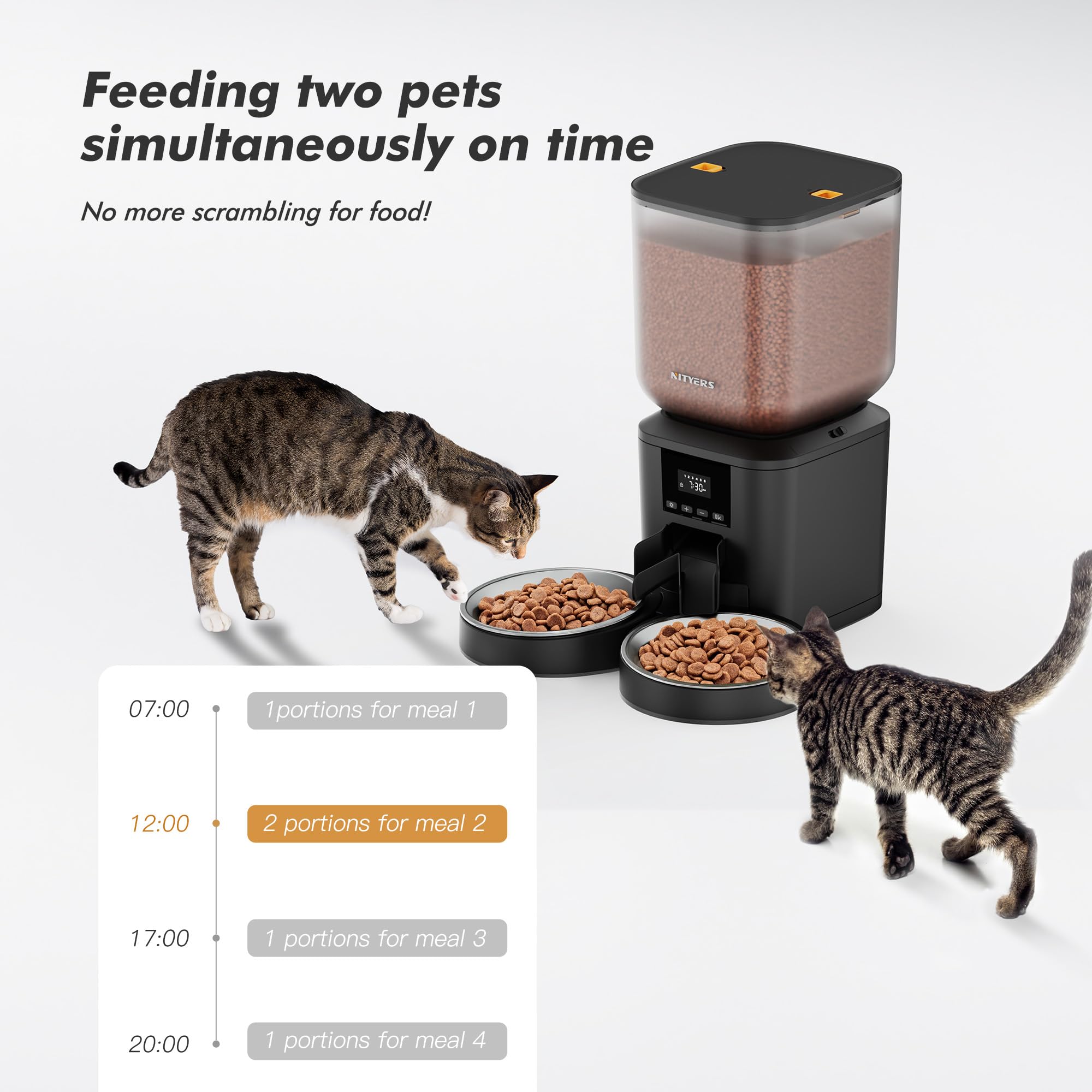 Balanced Feeding for Two: The Nityers automactic cat feeder serves two cats simultaneously, ensuring food is evenly distributed to both sides. This dual-feeding setup and central partition design promote harmony during mealtime, preventing competition and ensuring both pets get their fair share