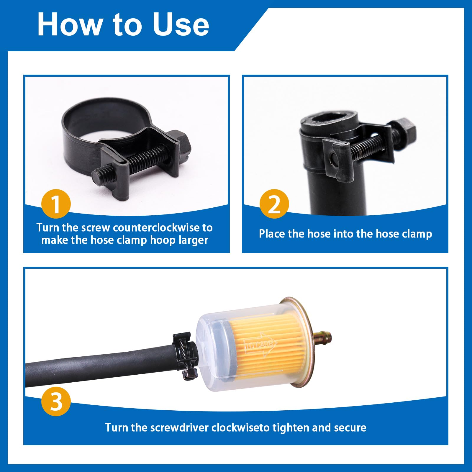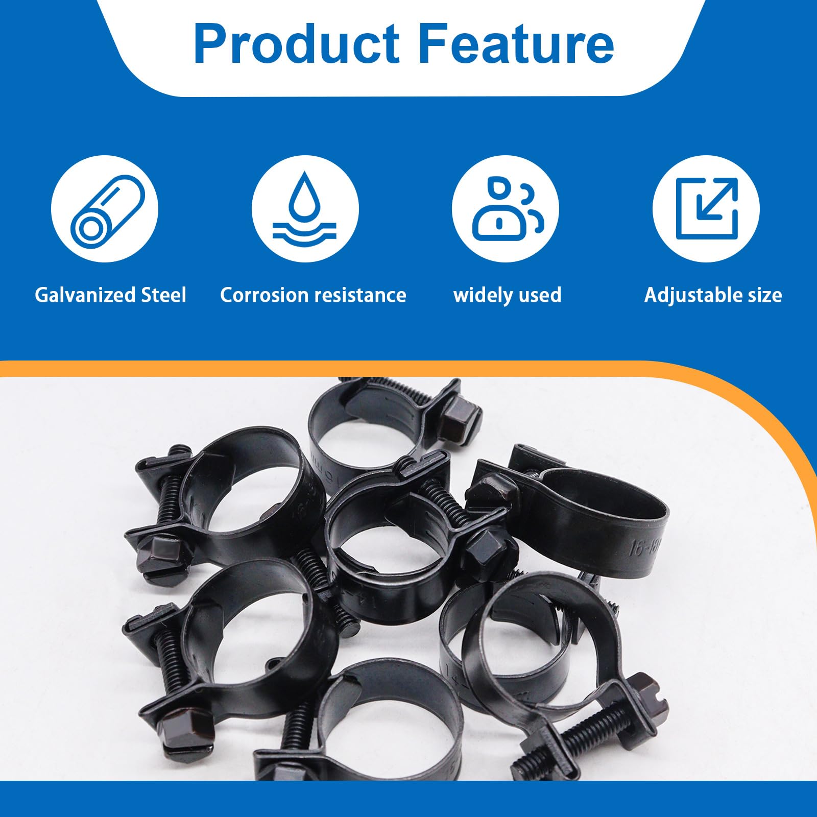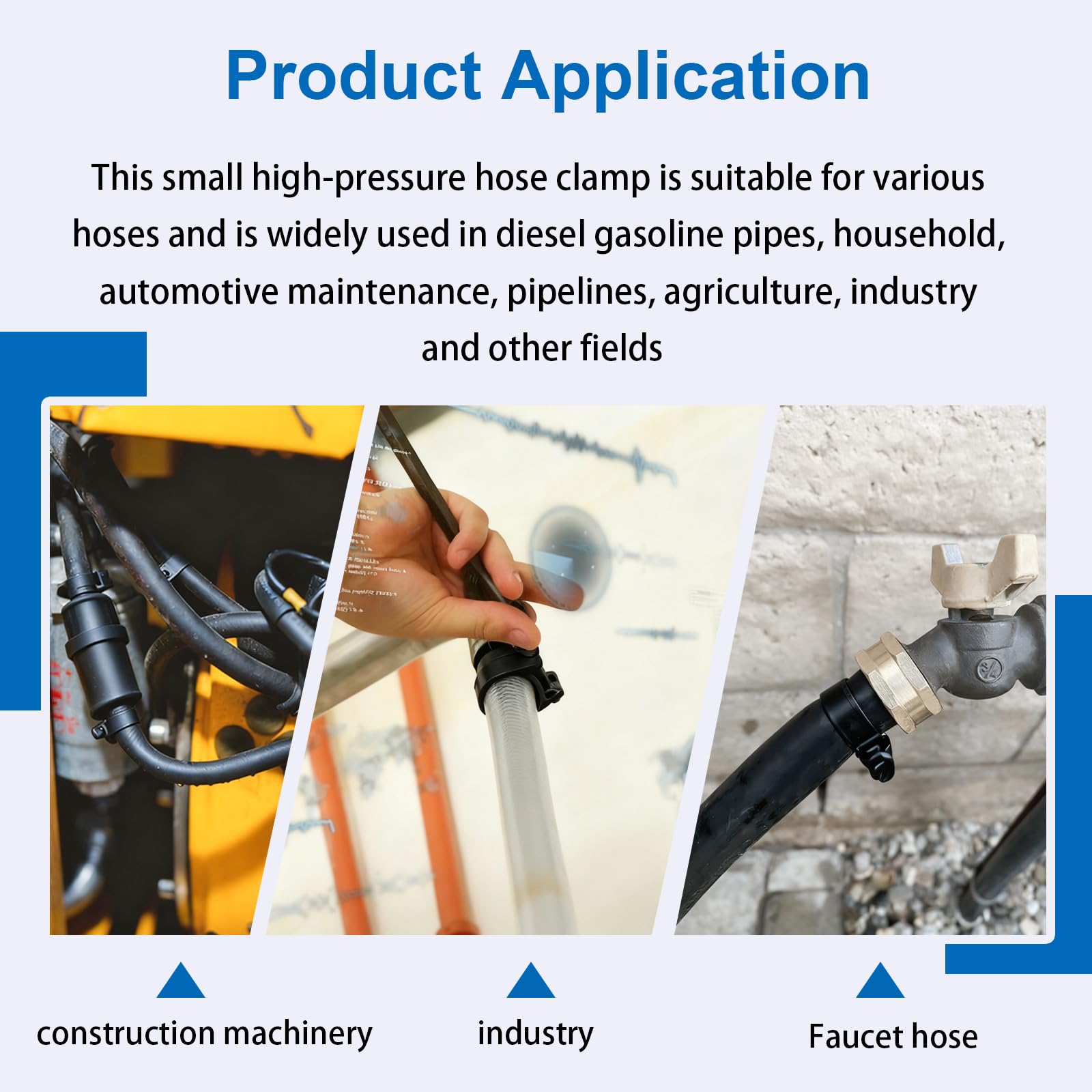 Widely Used:These clamps are locking secure and tight, would work much better than standard hose clamps, This small high pressure hose clamps fit for air hose, water pipe,fuel hose,silicone hose,etc.Widely used in diesel petrol pipe, home use,auto repair,marine,plumbing,agriculture,industrial ect.