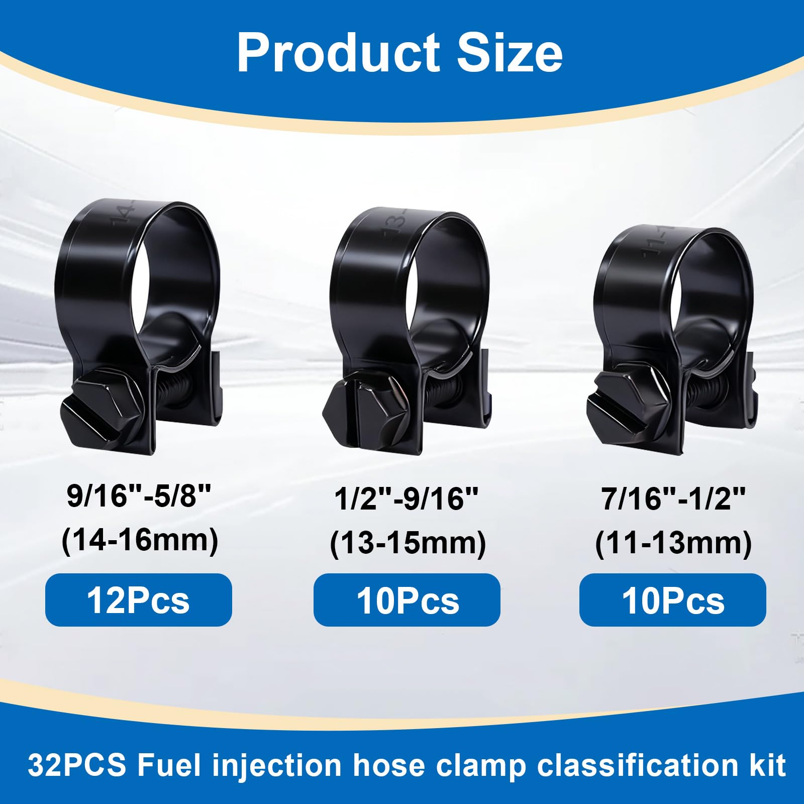 Hose Clamp Size:32Pcs Black Mini Fuel Injection Clamps are packed in a strong box. 3 different sizes- 7/16"-1/2", 1/2"-9/16", 9/16"-5/8".