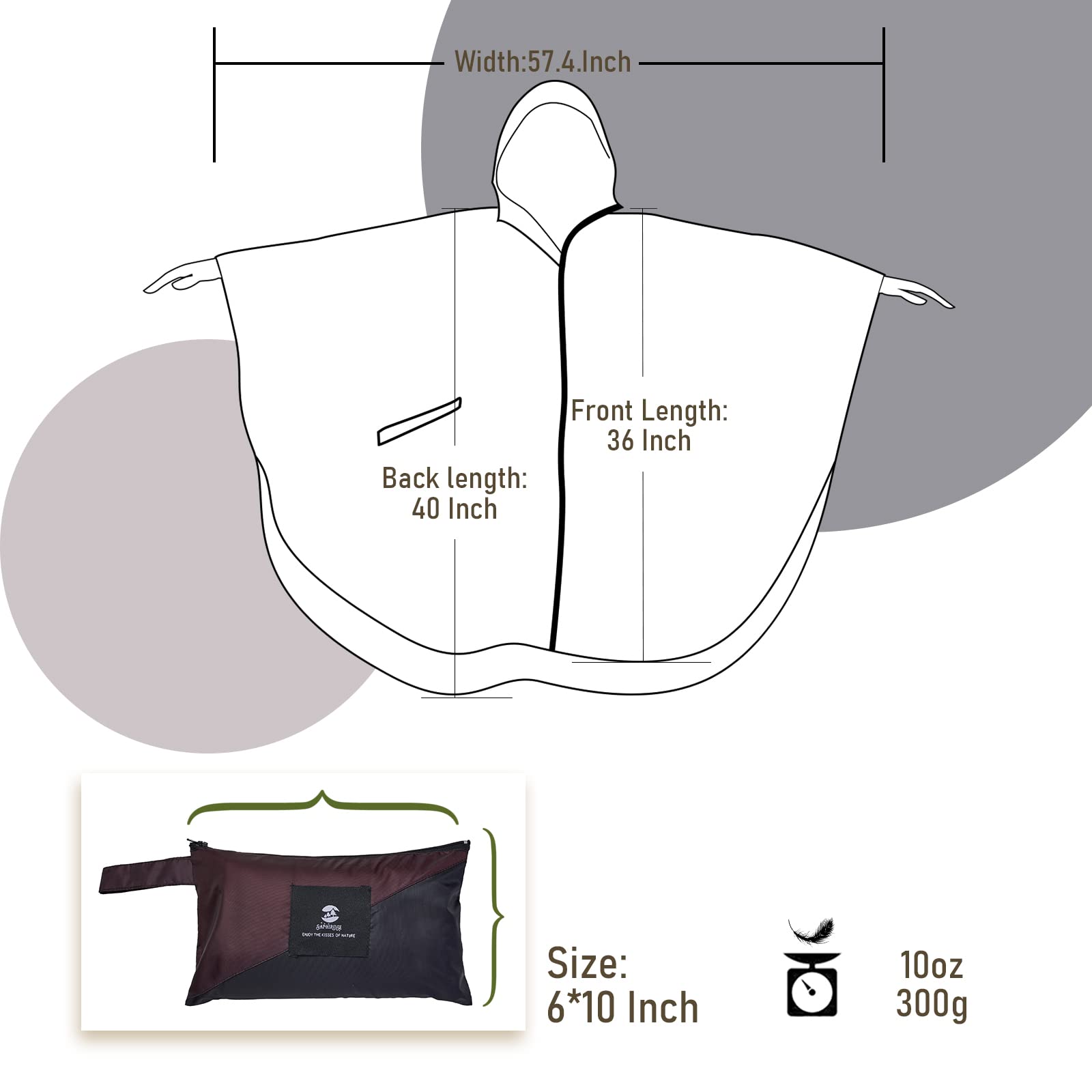 [Design]: Designed to be highly water-resistant and quick-drying, this poncho features a long body and a spacious hood with an adjustable elastic for a snug fit. For sizing details, refer to the provided information or contact us directly with any questions
