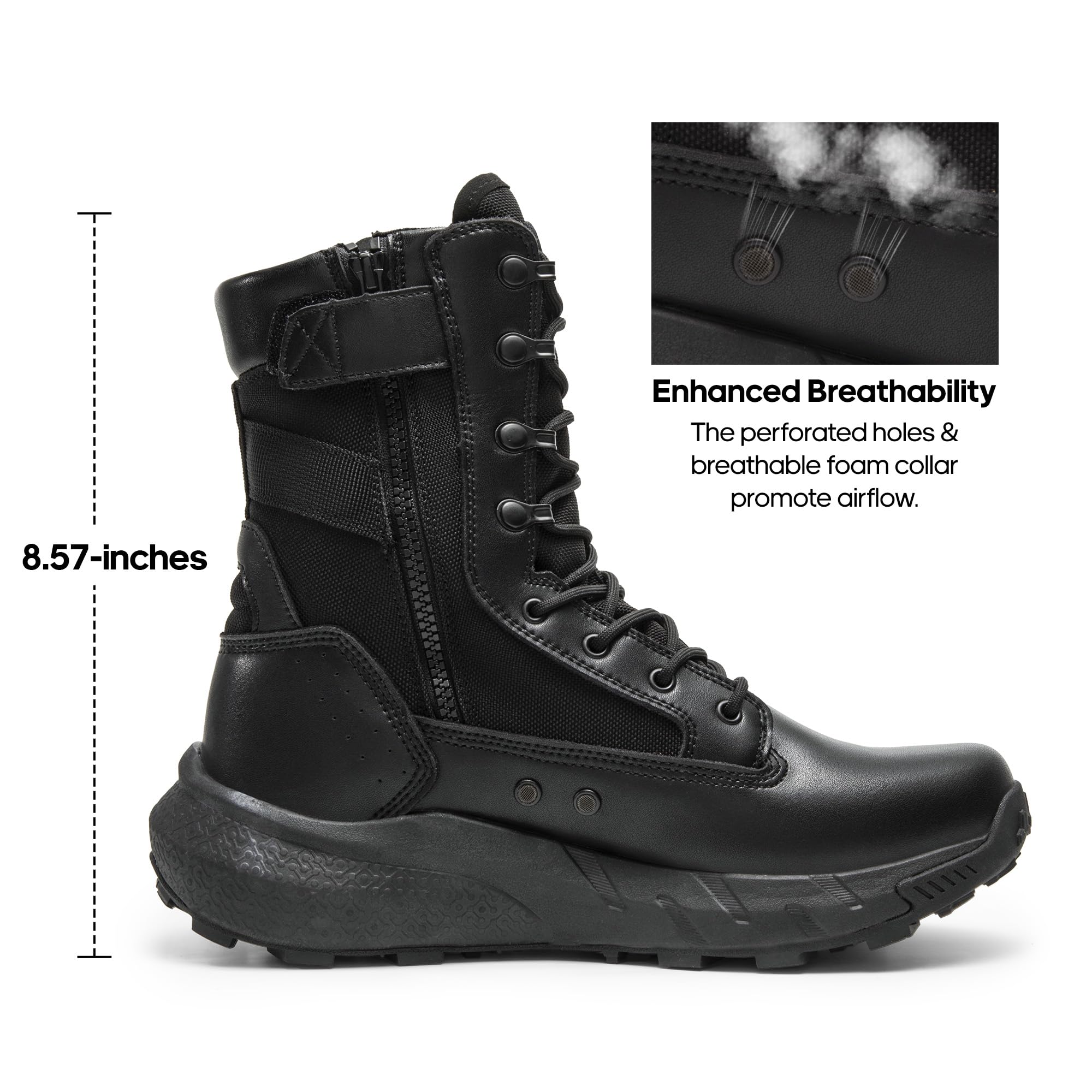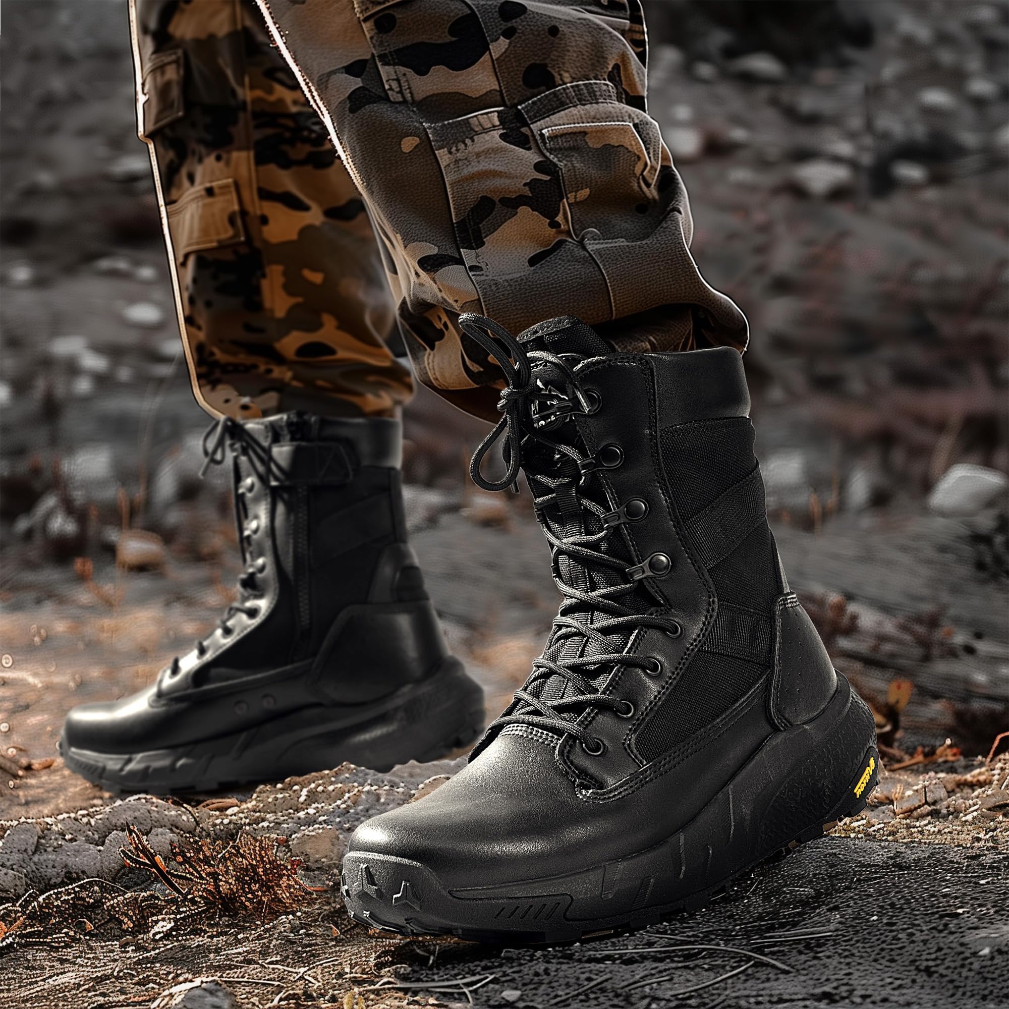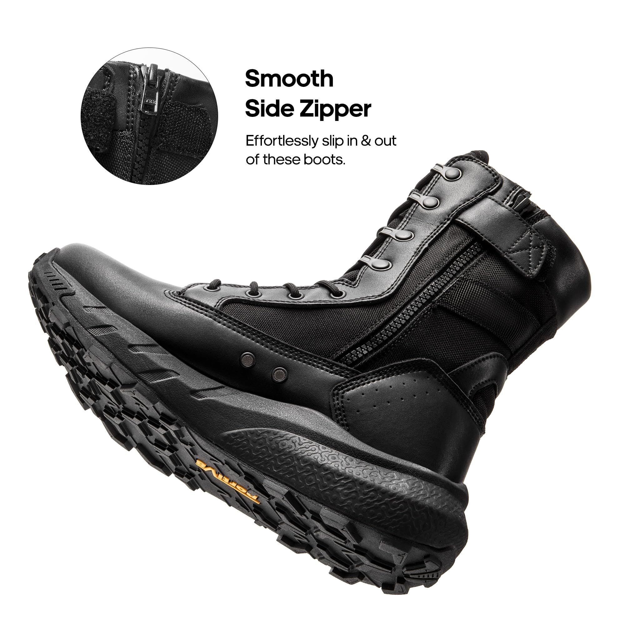 Easy On & Off: Featuring a convenient and smooth inner zipper, these tactical boots for men ensure effortless wear and removal.