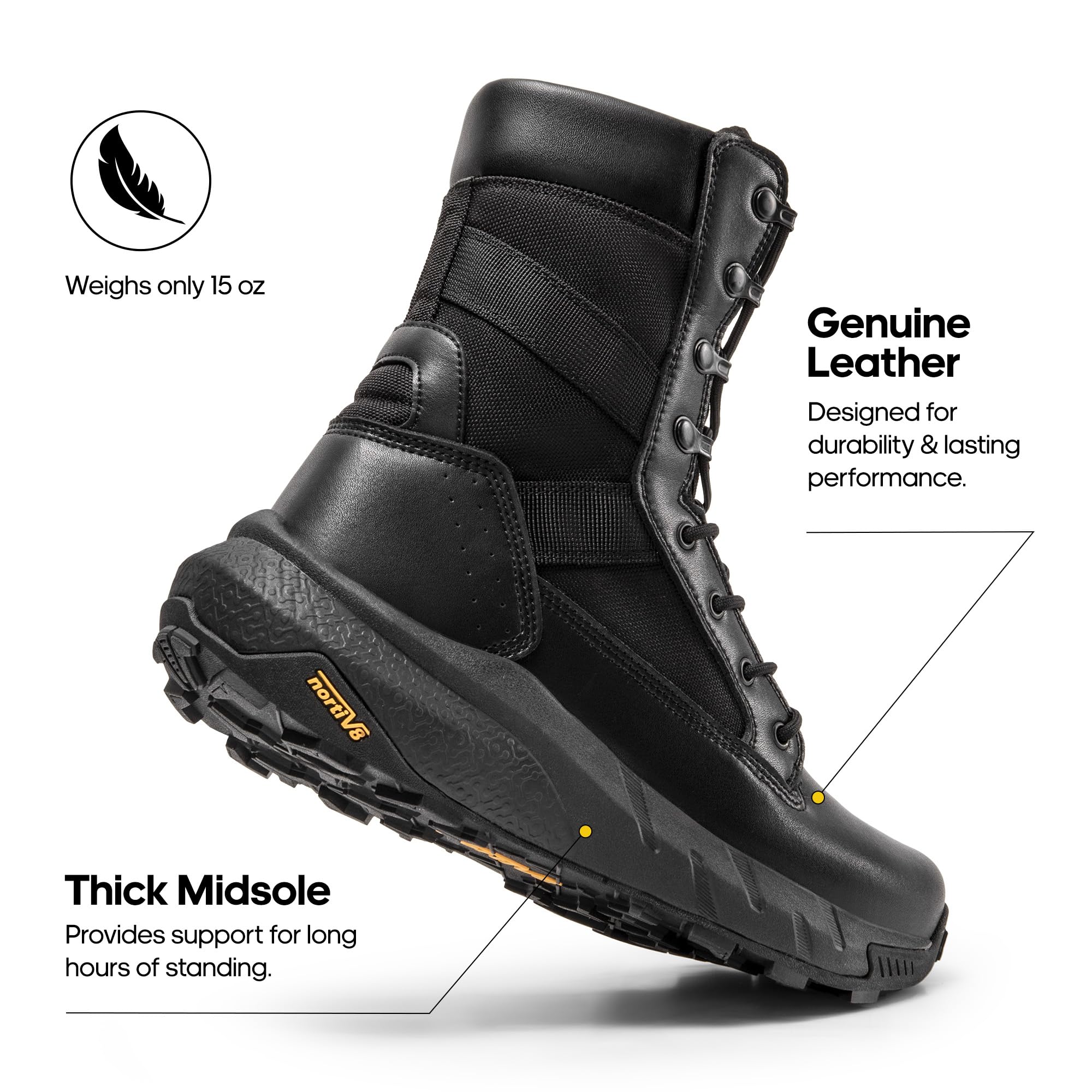 Sturdy & Protective: Designed to provide protection and minimize impact, the upper of these combat boots are made of genuine leather and durable textiles. Additionally, the gusseted tongue prevents debris from entering the boots.