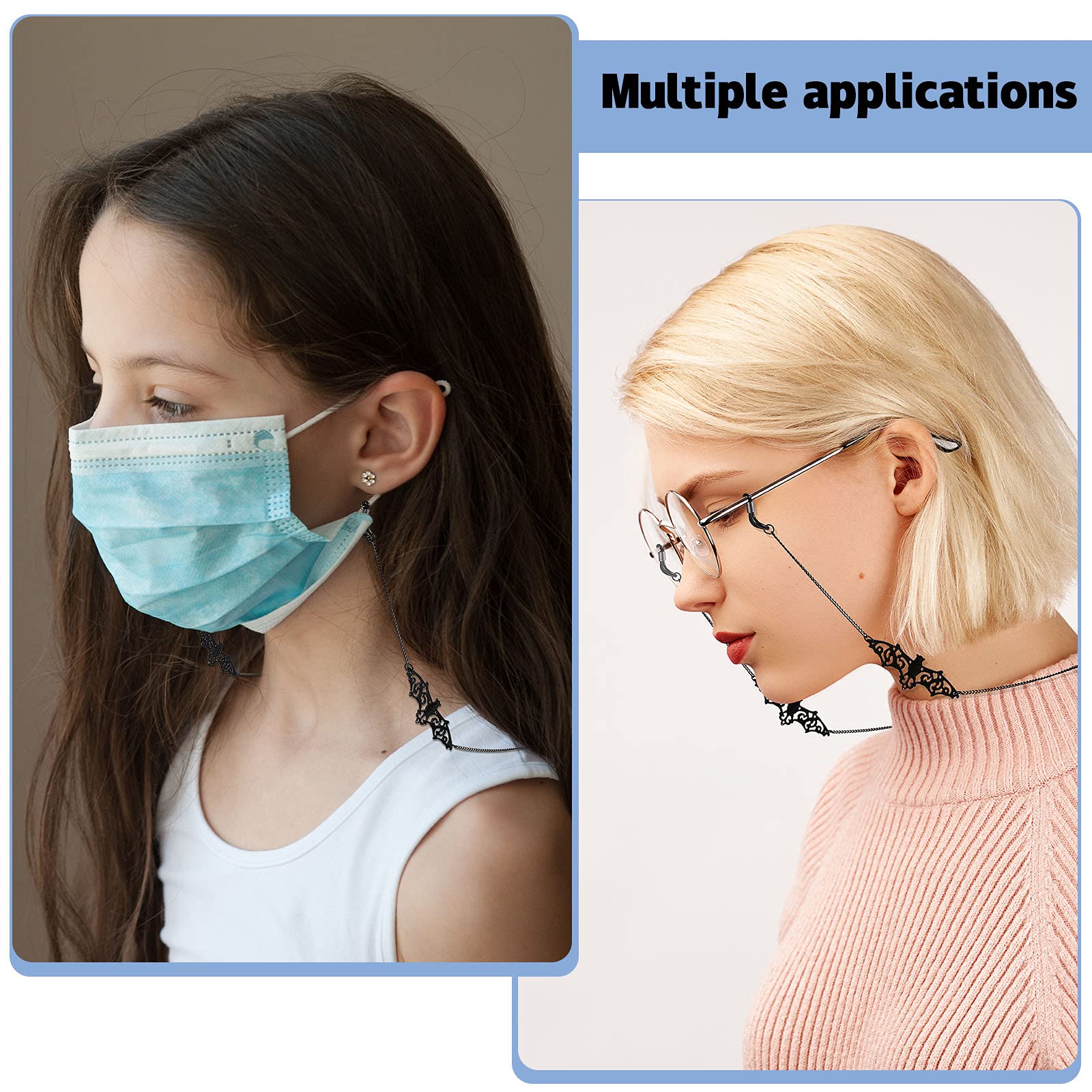 Chic design: our eyeglass chain is decorated with 2 hollow black bats on the side, chic and delicate, length of the eyeglass strap is approx. 75 cm/ 29.5 inches, both ends have adjustable holder loops with metal coil, can be slipped on and off easily to fix your eyeglasses, so that they can make it easy to attach to your glasses easily