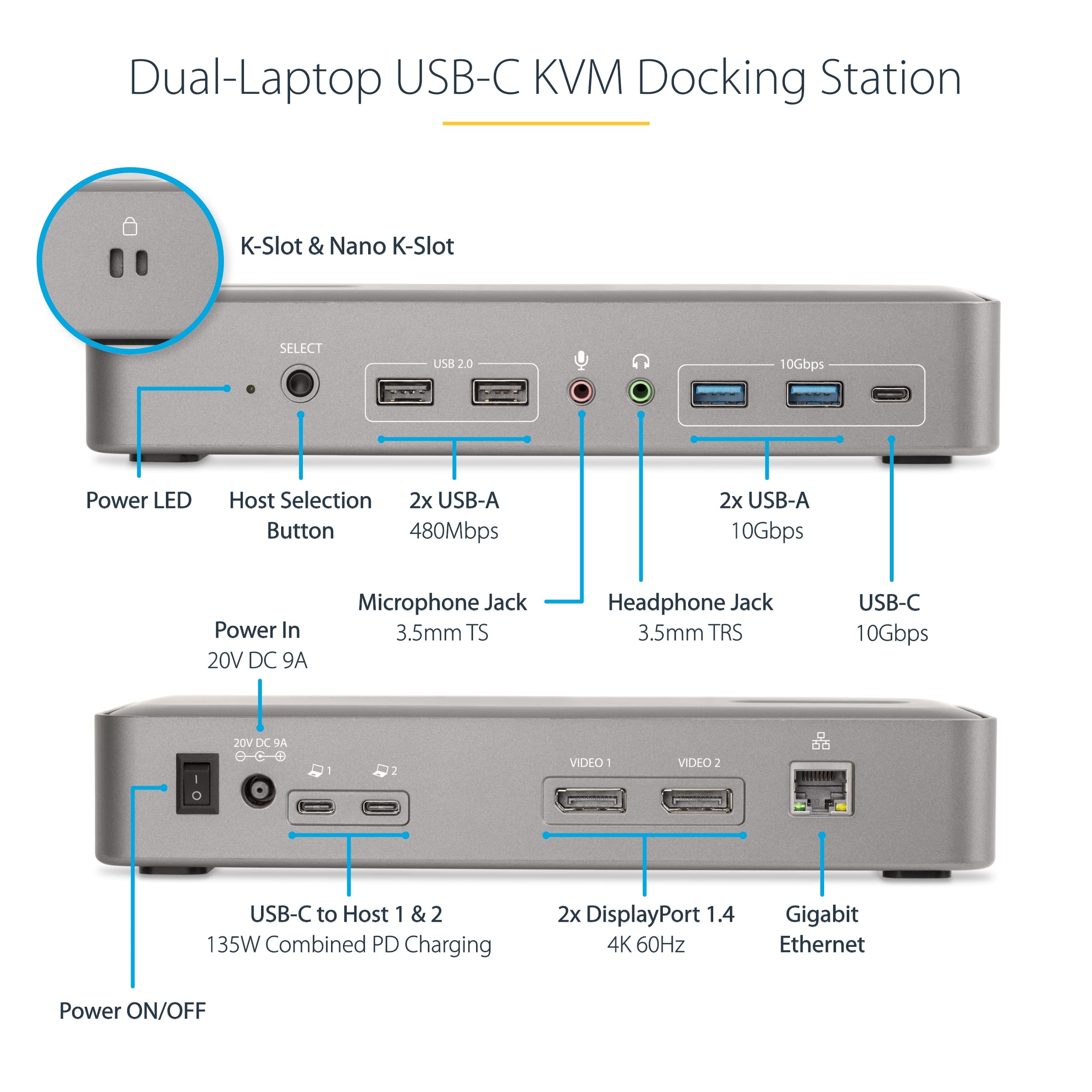 CONNECTIVITY: The dock features a variety of ports for device connectivity; 2x USB 2.0 Type-A HID, 2x USB-A (10Gbps), USB-C (10Gbps), 2x DisplayPort, 2x USB-C host ports, Gigabit Ethernet, 3.5mm stereo audio, 3.5mm mic, 2x K-Slots (Standard/Nano)