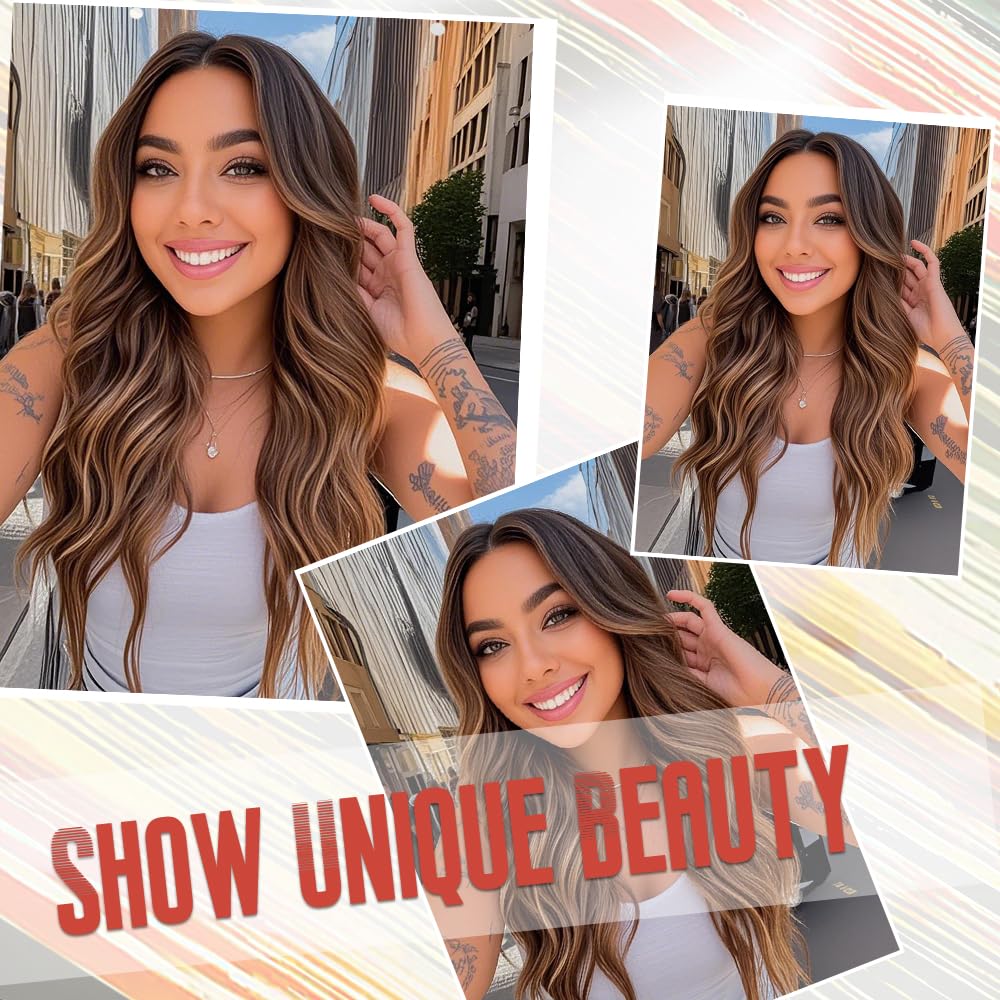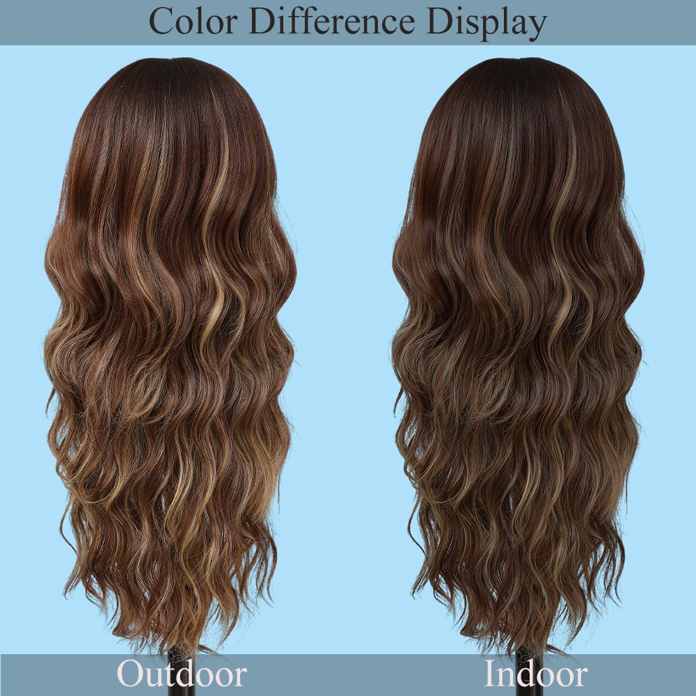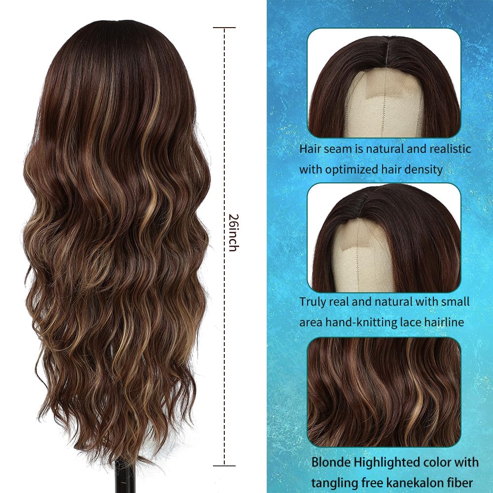 Long Brown Blonde Highlights Wigs for Women 26inch Wavy Curly Wig Natural Looking Middle Part Synthetic Heat Resistant Hair Replacement Wigs for Daily