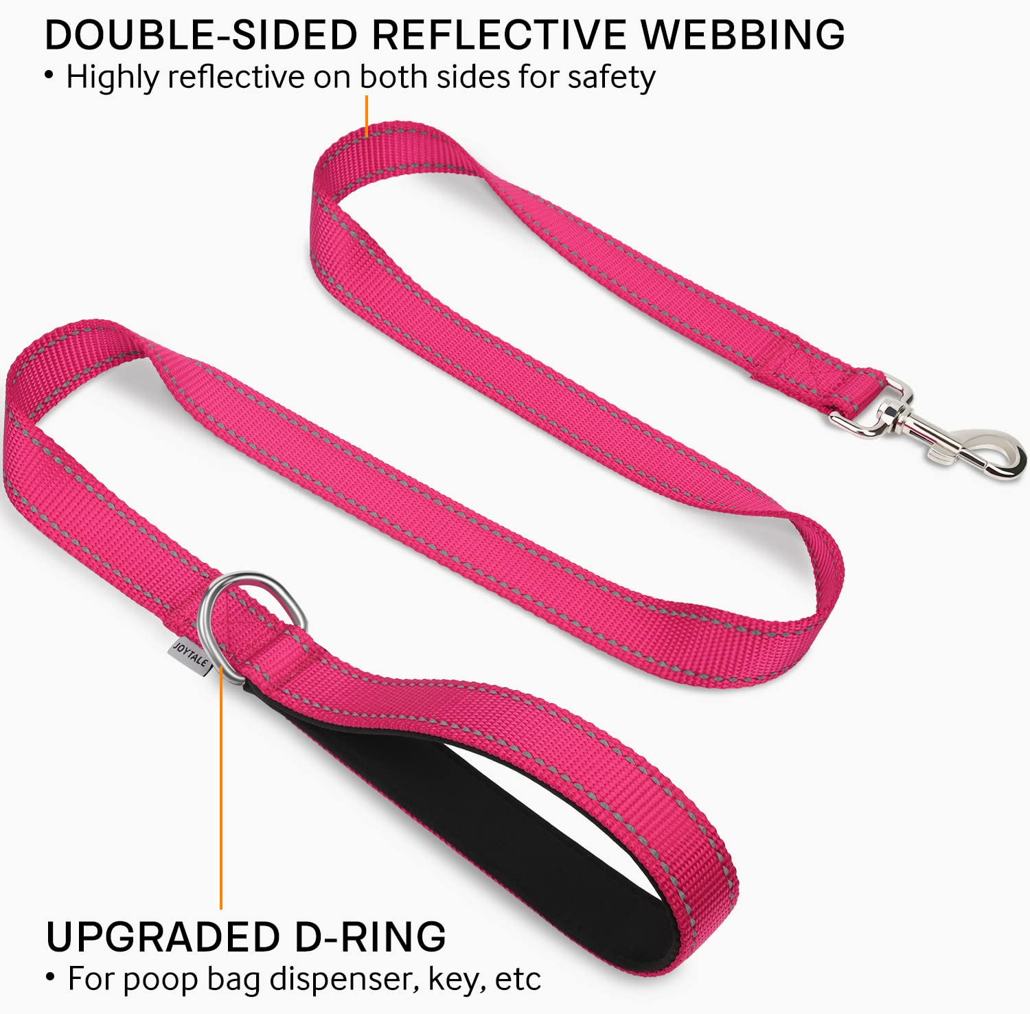 COMFORT GRIP: The handles have a soft cushion padding on the inside grip, which makes it is comfortable to hold and provides much comfort to control your active furry baby, protect your hand from rope burn. Also, come with a D ring on the handle to clip Joytale poop bags or accessories