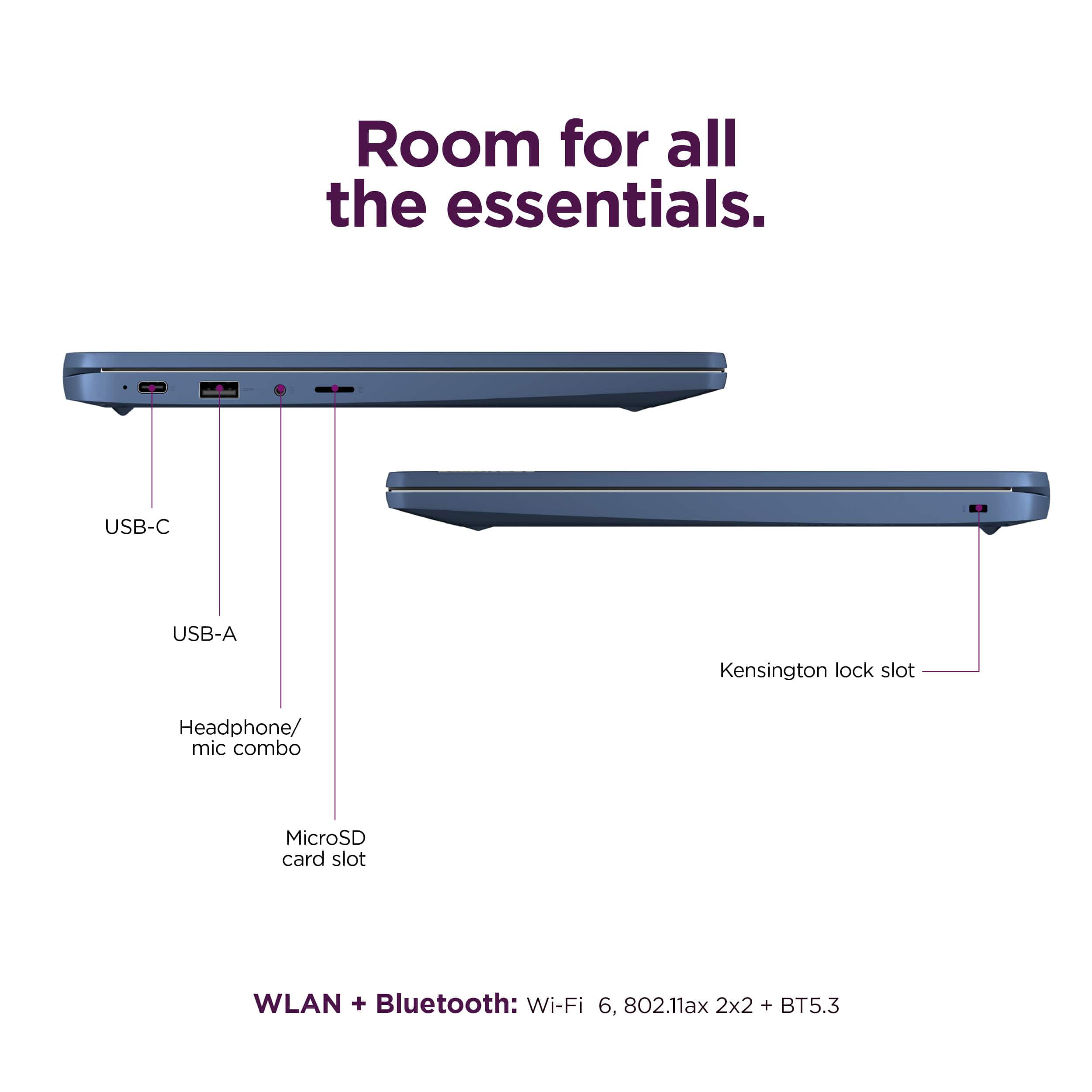 Get your groove on all day, every day Balancing work and play all day is a pleasure with the freedom of the 13.5-hour battery life. Life on the go has never felt so grounded. You can run multiple browsing tabs seamlessly, thanks to the power of MediaTek Kompanio 520 processor, housed in a solid fanless chassis. WiFi 6 delivers stable signal strength with fast up and download speeds for sharing. And the 14″ touchscreen display makes organizing your files and media effortless. Blurs the line between work and play Whether you’re catching up with your favorite show, checking out YouTube, or attending virtual classes, the 14″ FHD display provides a fantastic viewing experience. The IPS display with 100% sRGB color gamut is crisp and rich with vivid clarity and vibrant contrast that holds even from a wide viewing angle. An anti-glare coating makes reflections a non-issue and Waves-tuned audio through two forward-facing Maxx Audio speakers complements the visuals with great sound quality. Privacy is calling Keep your conversations secure and private with a privacy shutter built into the HD camera and a mute mic key. Make video calls that are crystal clear via HD while the dual mike array eliminates distracting background noise. When you’re done calling, close the built-in camera shutter manually to secure an extra layer of privacy. Technical Specifications Display: 14" FHD (1920 x 1080), Anti-glare, 300nits, 100% sRGB, Touchscreen display Processor: Octa-core MediaTek Kompanio 520 (8C, 2x A76 @2.05GHz + 6x A55 @2.0GHz) Graphics: Integrated ARM Mali-G52 2EE MC2 GPU Memory: 4GB Soldered LPDDR4x-3733 Storage: 64GB eMMC 5.1 + 128GB SD Card Networking: Wi-Fi 6, 11ax 2x2 + Bluetooth 5.1 Operating System: Chrome OS Battery: Integrated Li-Polymer 47Wh battery; Google power load test: 13.5 hr Camera: HD 720p camera with Privacy Shutter Keyboard: Non-backlit, English Speakers: Stereo speakers, 2W x2, optimized with Waves MaxxAudio Audio Chip: High Definition (HD) Audio Security: Google Security Chip H1 Dimensions: 12.83 x 8.73 x 0.73 inches Weight: 2.87 lbs I/O Ports USB-C 3.2 (support data transfer, Power Delivery 3.0 and DisplayPort 1.1a) USB 3.2 Gen 1 Headphone / microphone combo jack (3.5mm) microSD card reader Kensington Nano Security Slot