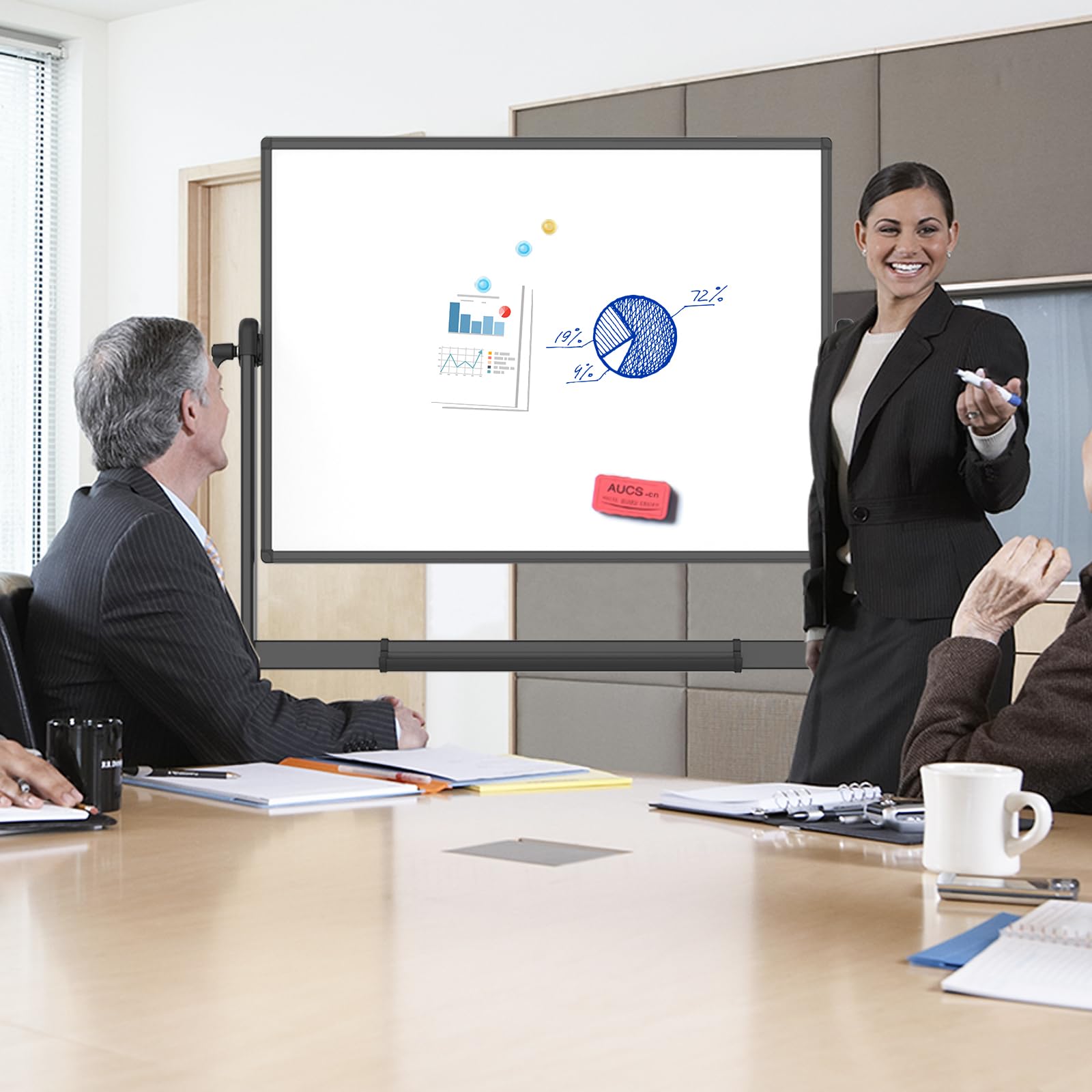 [Double-sided Mobile Whiteboard] Board dimensions: 48" x 36" ( frame included); Writing surface size: 46" x 34". Our double-sided rolling magnetic dry erase whiteboard makes your presentation, teaching or training more efficient and orderly.