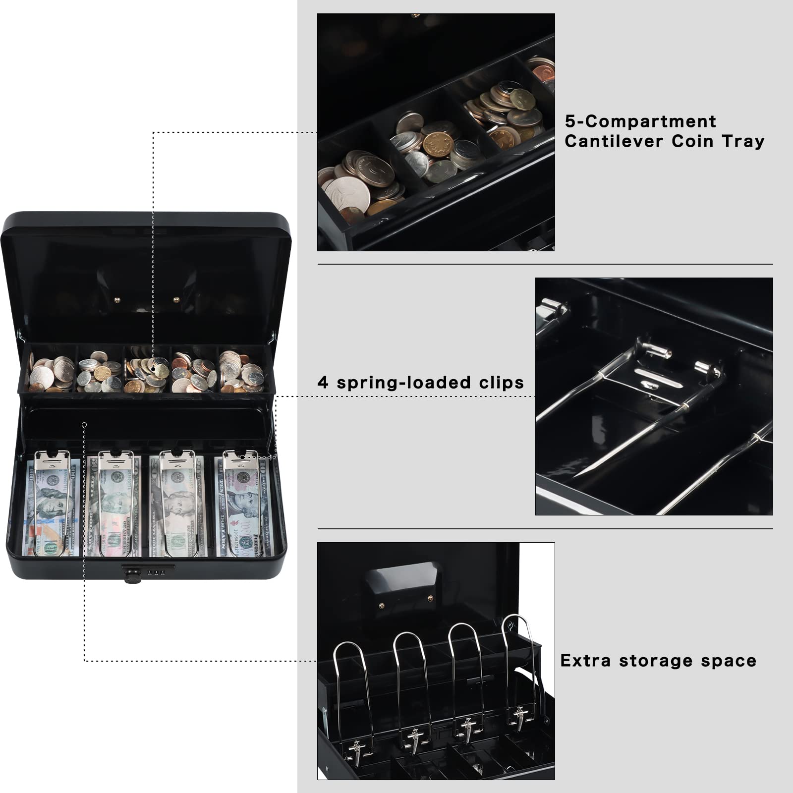 【TIERED AND CANTILEVER DESIGN】Unique, convenient tiered tray design allows for full view of entire working area. Five-compartment cantilever coin tray automatically opens for use when lid is opened. Four spring clips at the bottom of cash box can make your bills be well organized, they hold bills in their place even in a windy outdoor environment.