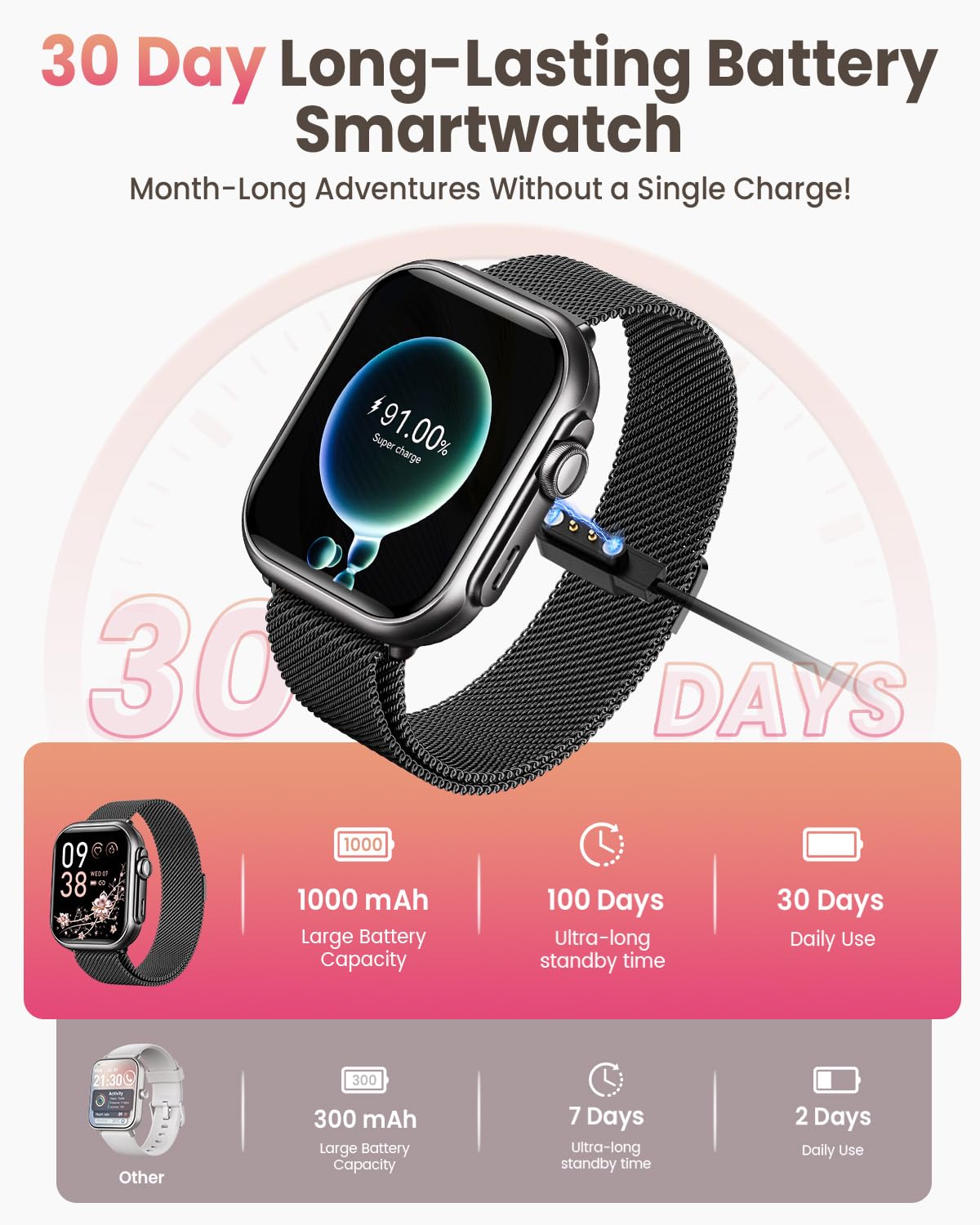 30 Days+ Battery Life:Smart watches for men women features a massive 1000mAh battery, offering 30 days of use (100 days standby) on a single 2.5-hour charge. Perfect for outdoor adventures, business trips, or daily fitness tracking without constant charging. Compatible with iOS 9.0+ and Android 6.0+ smartphones, it outperforms some other android smart watch and smart watch for iPhone compatible devices in battery capacity