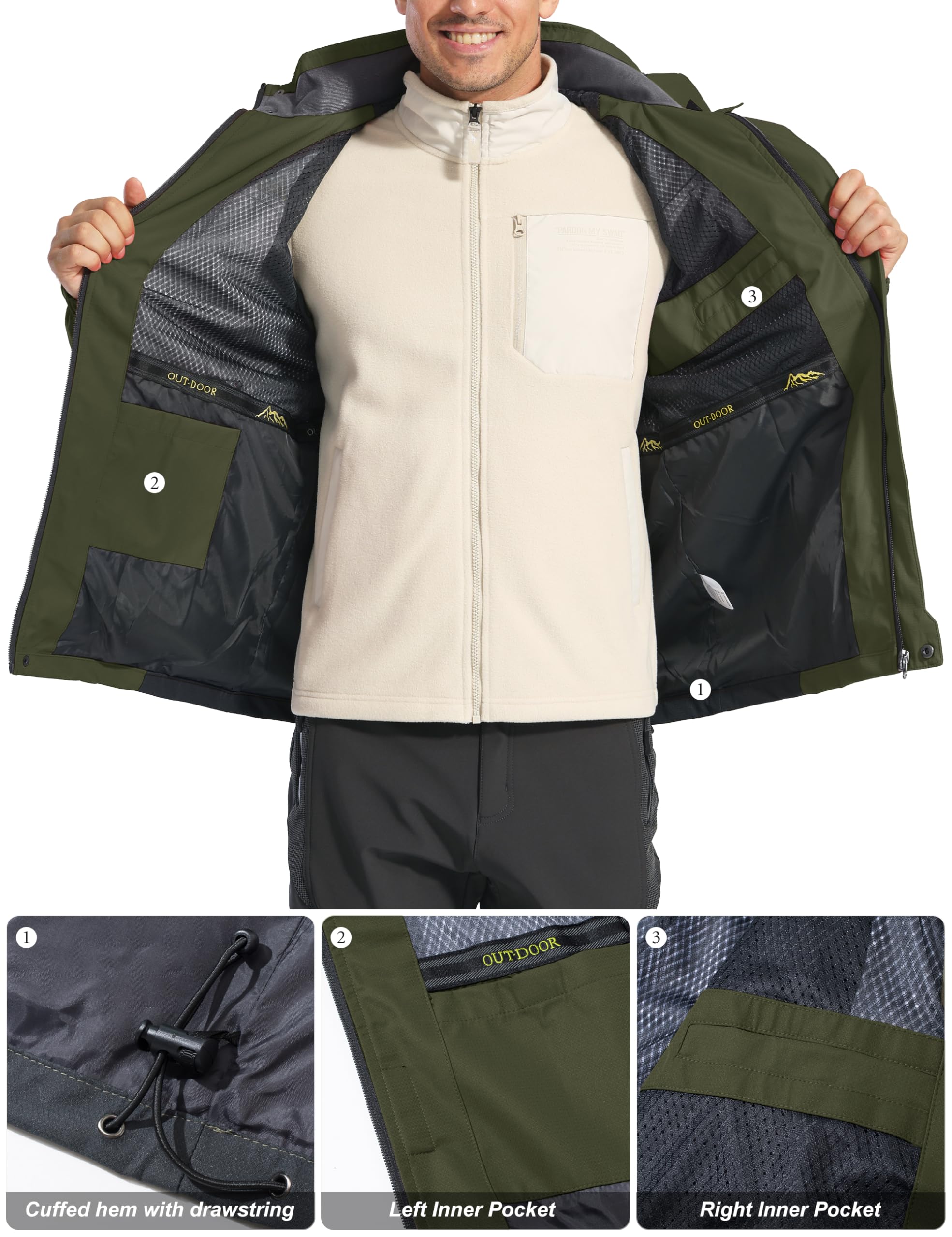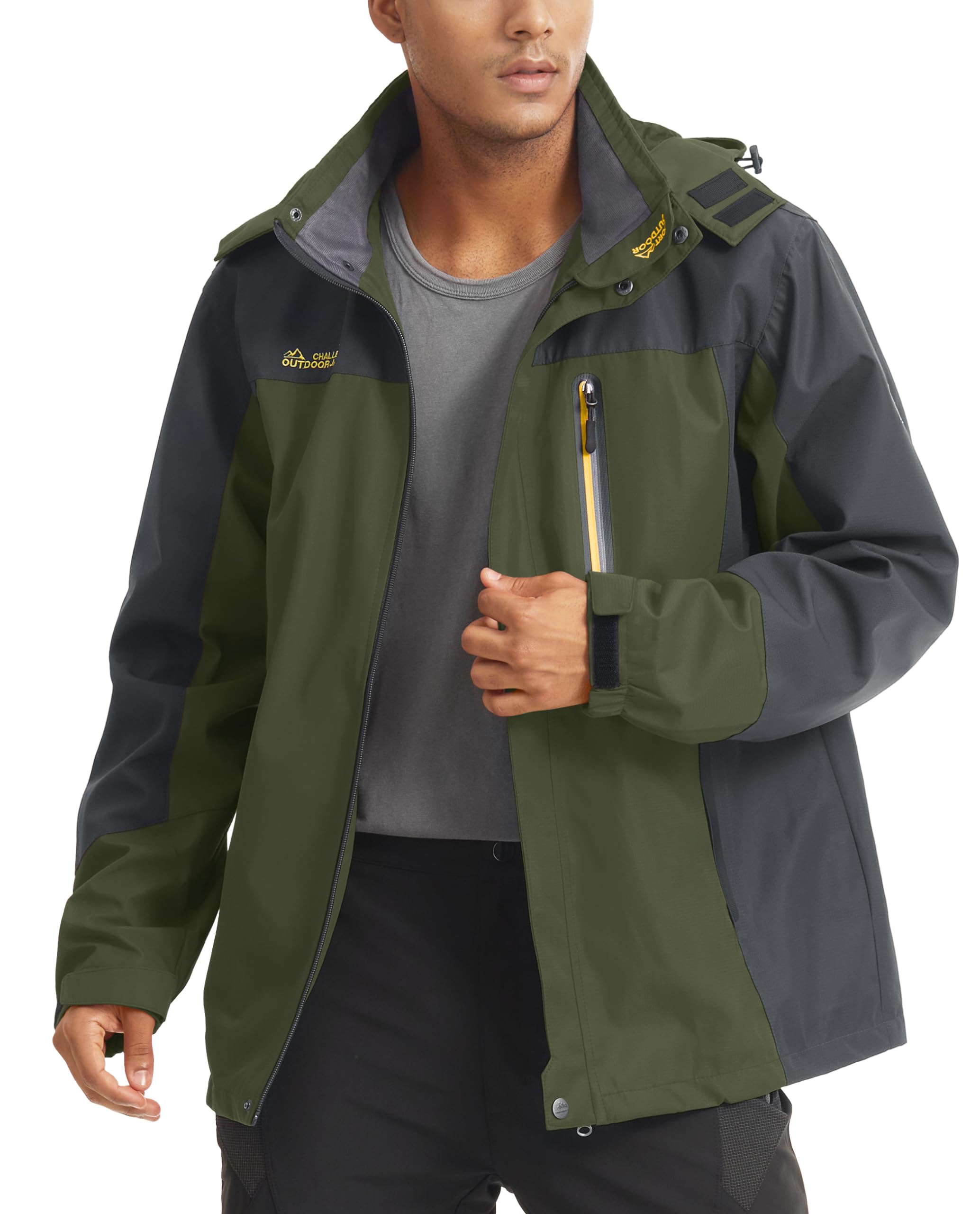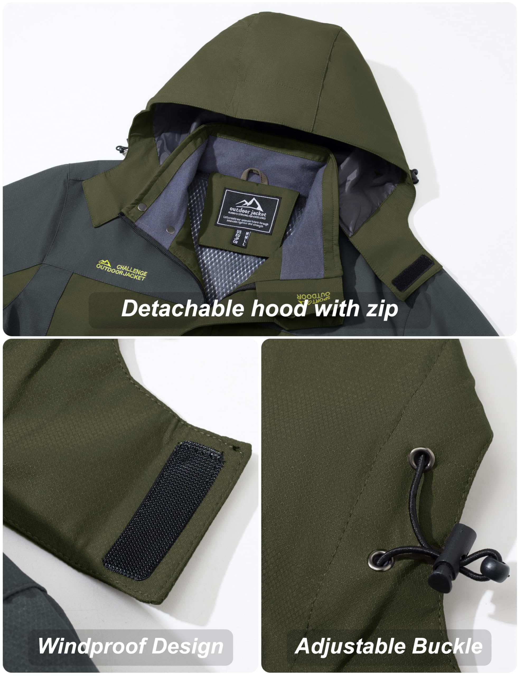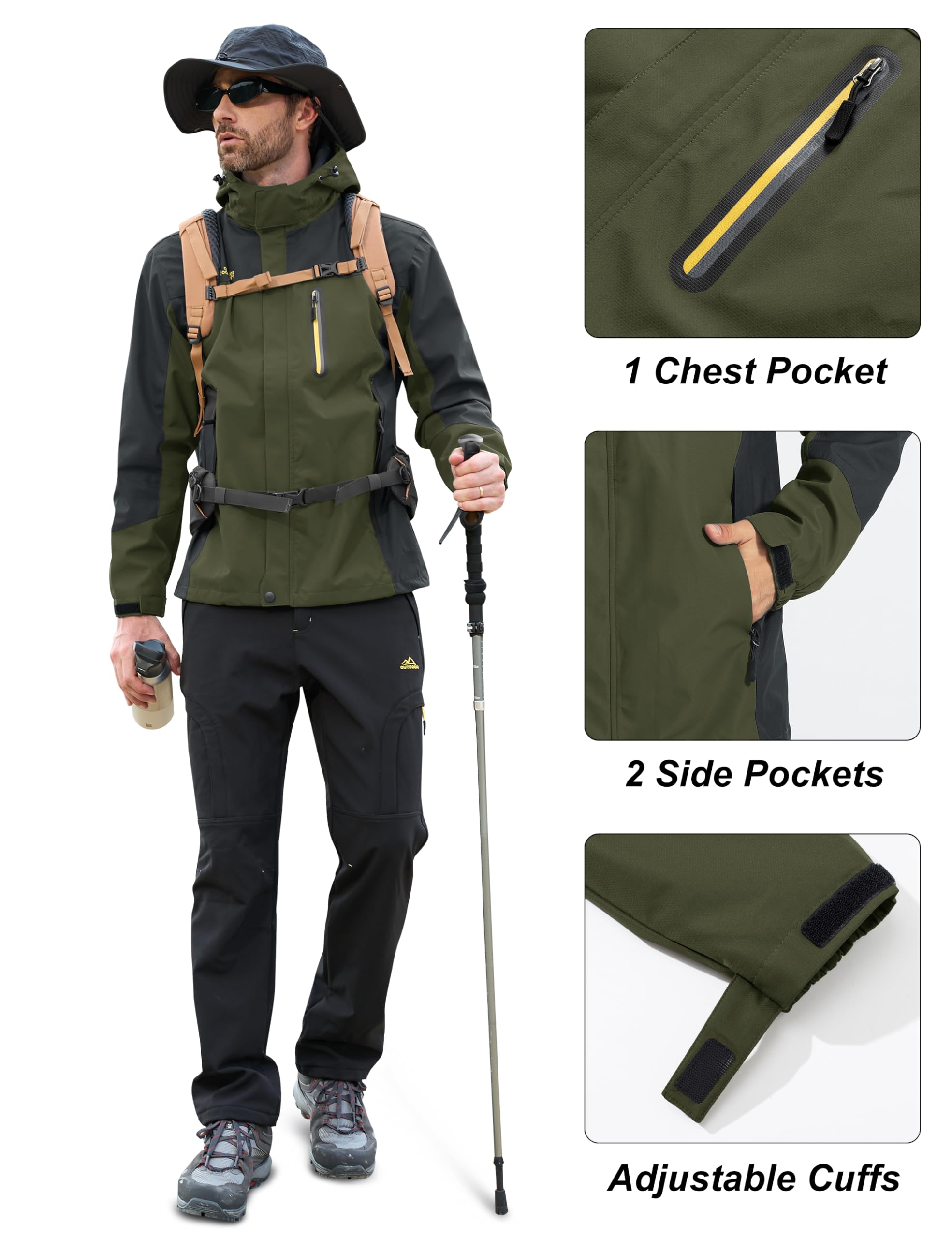 [5 Pockets] This mens hiking jacket has 2 large zipper hand pockets, 1 waterproof zipper pocket on left chest, 2 inner pockets,it can safely store personal items such as mobile phones, keys and cards