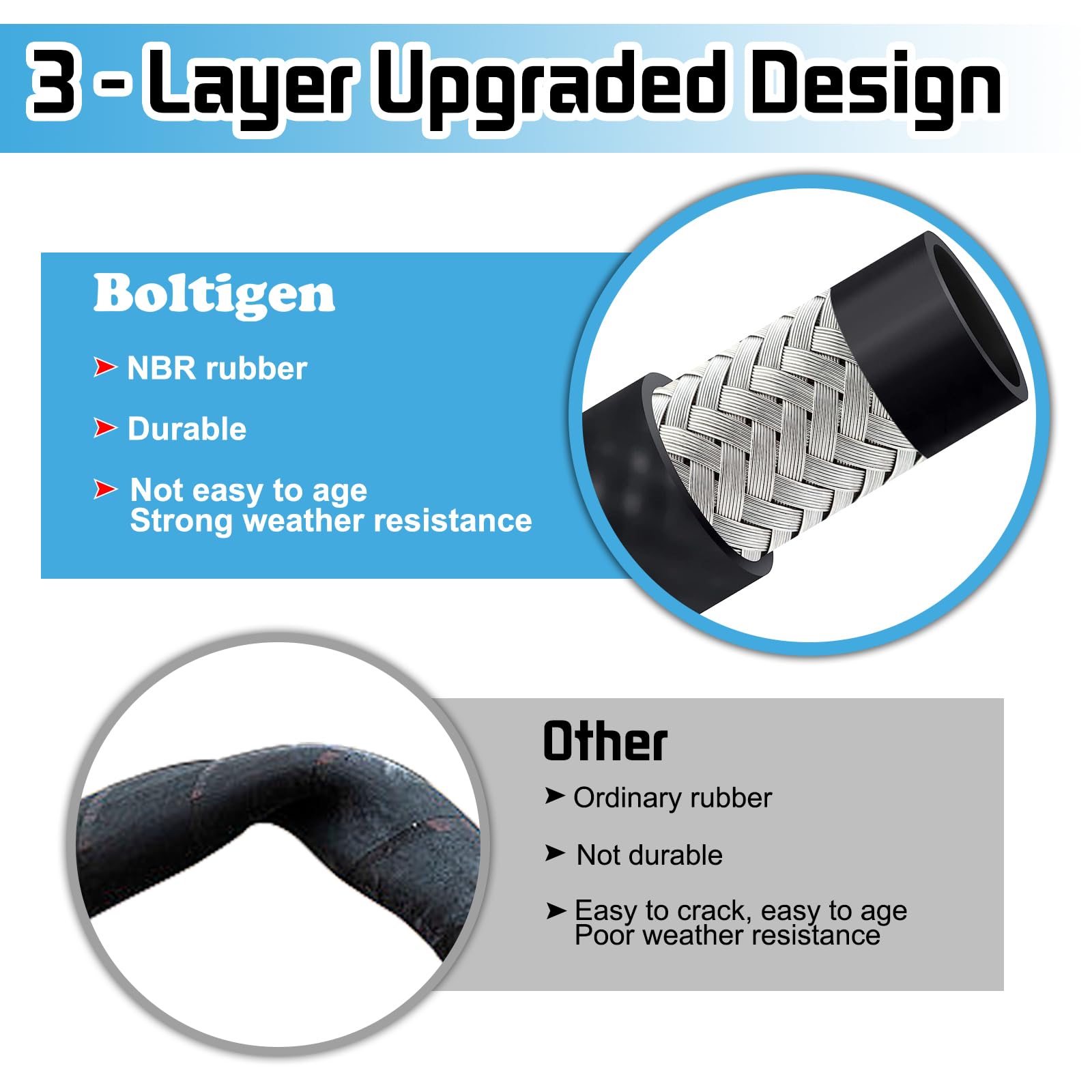 【Material】Nitrile rubber inner, stainless steel braid in the mid, PVC and Nitrile blended rubber outer, this fuel transfer hose is designed to withstand the effects of various fuels and fluids. The rubber material offers excellent durability, flexibility, and resistance to abrasion, ensuring a long service life even when exposed to harsh conditions.