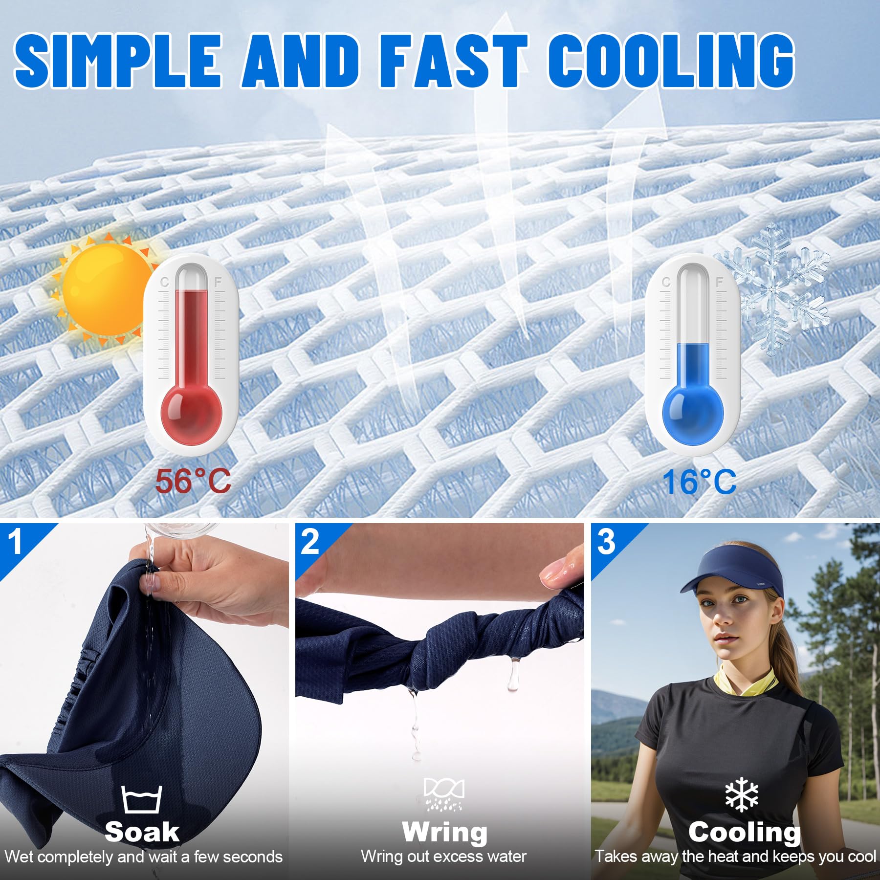INSTANT COOLING: Our Cooling visor can be used to cool your head in the summer. There are three steps to using a strapless visor: wet it, wring it out, and snap it tight to remove excess water. As long as the elastic headband of the golf visor remains wet, the cooling will continue. The visor stays cool for 2 hours so you can comfortably stay active for longer.