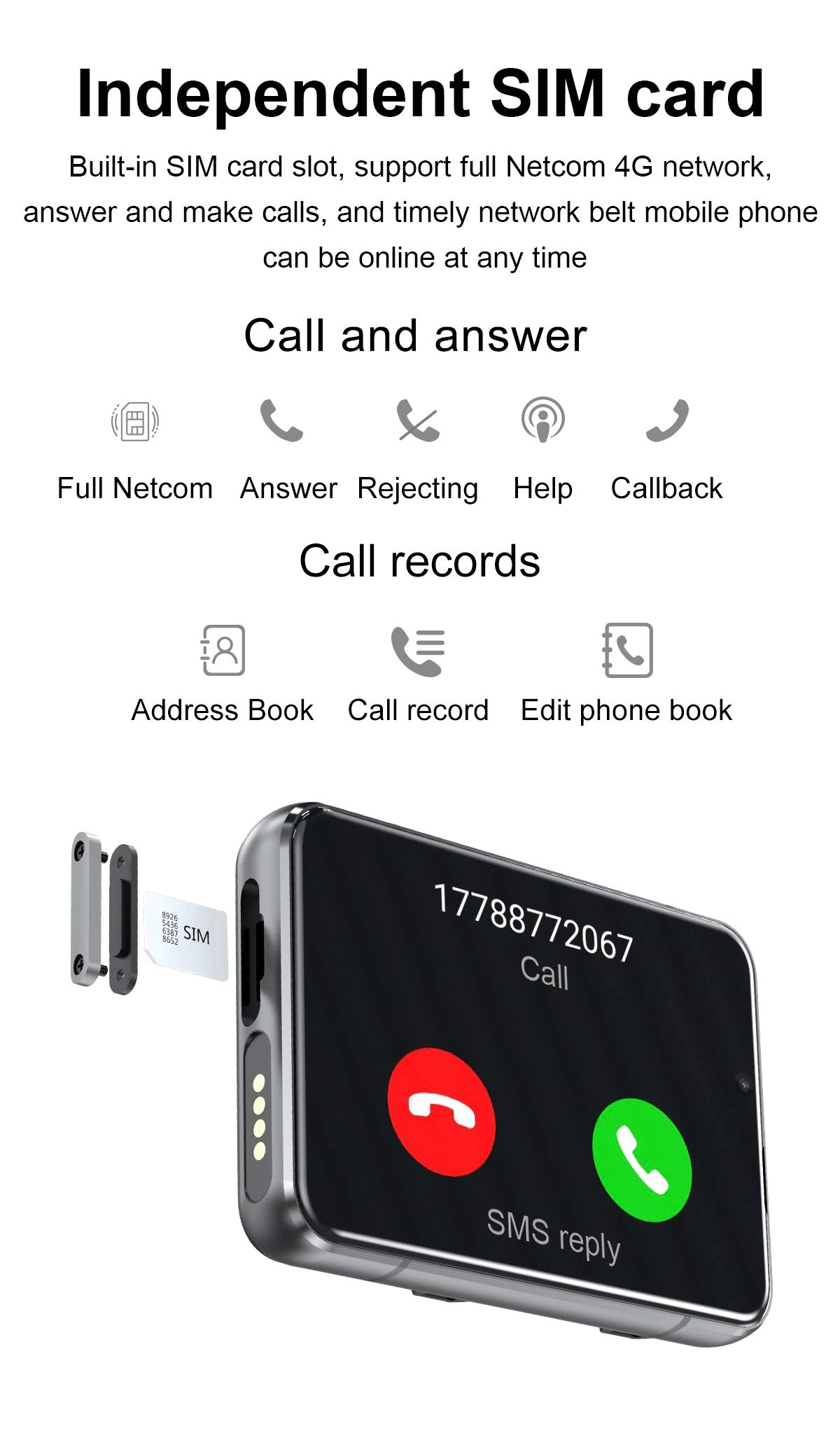 lndependent SIM card: The Smart watch built-in SlM card slot, support full Netcom 4G network and WiFi wireless fast Internetaccess. Support video call, text message, voice call and other functions, high-speed and stable network connection, easily handle important information on your wrist. (Note: The package does not include a SIM card.)
