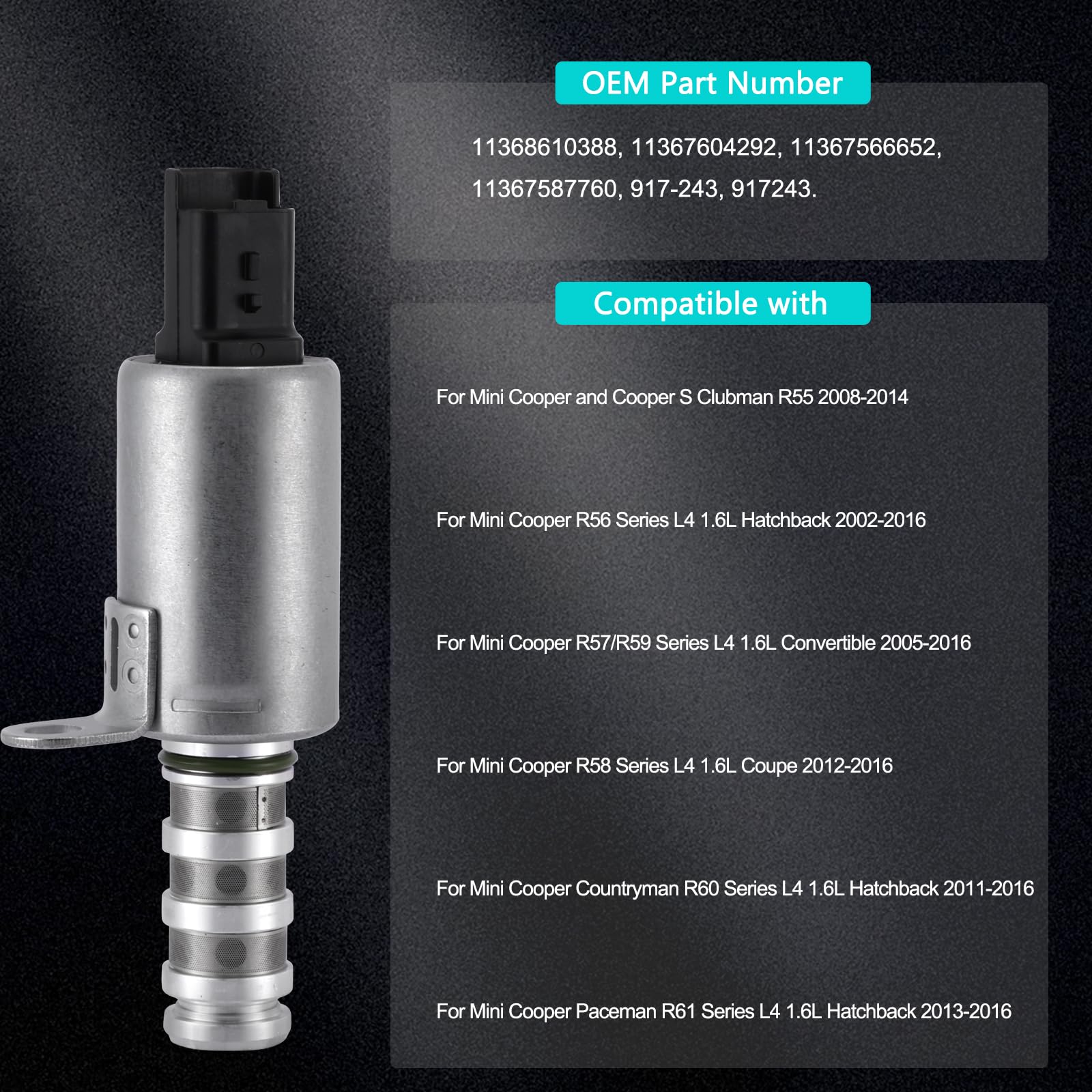 【Premium Performance】 The Oil Control Variable Valve Timing Solenoid using premium O-rings properly prevent premature oil leaks. Accurately control the flow of oil to avoid engine failure caused by excessive or insufficient oil pressure and improve the stability of the overall VVT system operation.