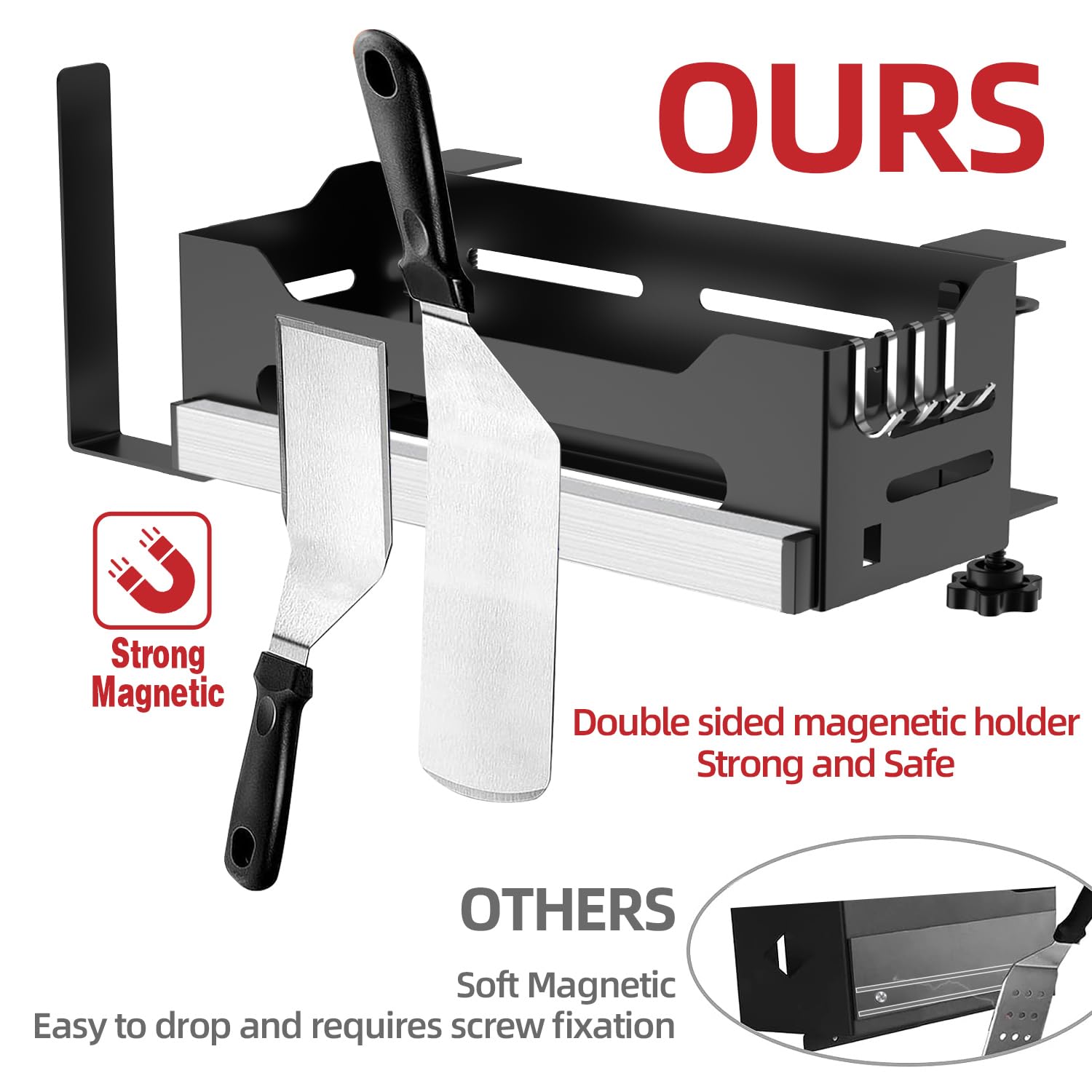 Improved Strong Magnetic Strip: Our double-sided magnetic strip ensures a secure placement for your Blackstone griddle accessories, providing superior stability. Say farewell to accidental slips and loose items—our Blackstone accessories caddy offers a dependable hold, without the need for screws.