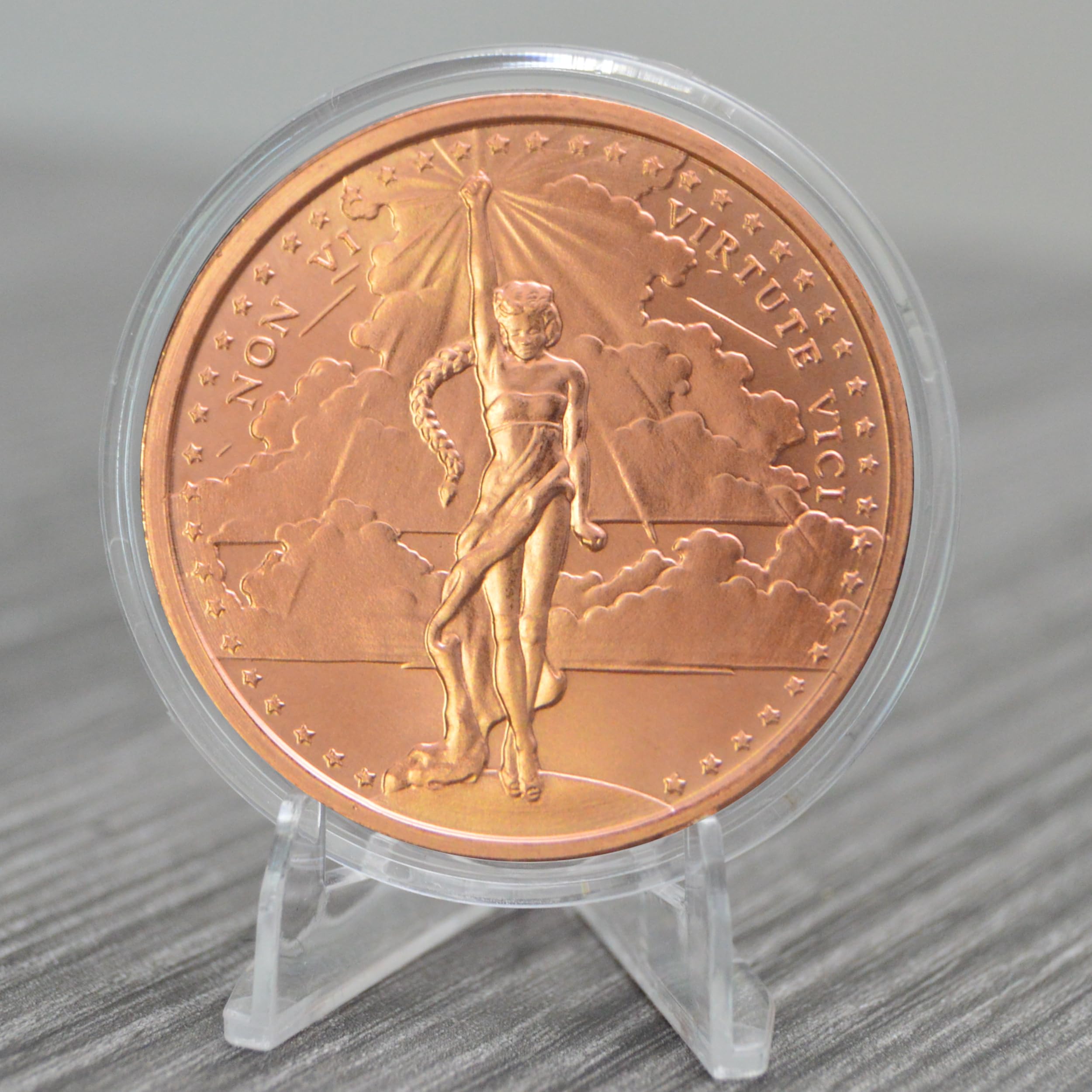 Celebrate the essence of resilience with the Non Vi Virtute Vici 1 oz Pure .999 Copper Medallion. This medallion embodies the profound statement, "Not By Violence But By Excellence I Have Conquered", underscoring the significance of achievement through merit and determination. A testament to the indomitable spirit of those who conquer challenges not by force, but through excellence, this piece serves as an emblem of perseverance and valor. Minted with unwavering precision in the USA, it boasts an AVDP ounce of .999 pure copper, reflecting both its tangible value and the philosophical depth of its inscription. It is more than just a collector's piece; it's a narrative of overcoming odds and attaining victory through superior ability and skill. To ensure its pristine condition and radiant luster for years to come, each medallion comes encapsulated in a protective sheath. Included with every medallion is a Certificate of Authenticity (COA) by Heavenly Metals, confirming its purity, weight, and origin. This affirmation fortifies the integrity of your investment. With its poignant message and unparalleled craftsmanship, the Non Vi Virtute Vici 1 oz Copper Medallion serves as a daily reminder of the power of excellence and the triumphs it can bring.