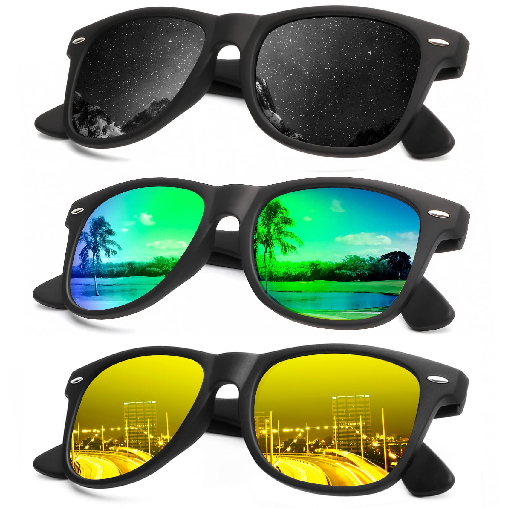 ★ Be More Relaxed Every Day ▶ Those sunglasses come with top rated polarized lenses that we tested over time. Polarization reduces glare reflected by mirrors, shiny or polished materials or any other kind of sun rays reflection. You will feel your eyes permanently relaxed because you will not squint anymore! Whether you are driving to work or having a nice sunbath on the beach, you will be less tired at the end of the day because your eyes are more relaxed.