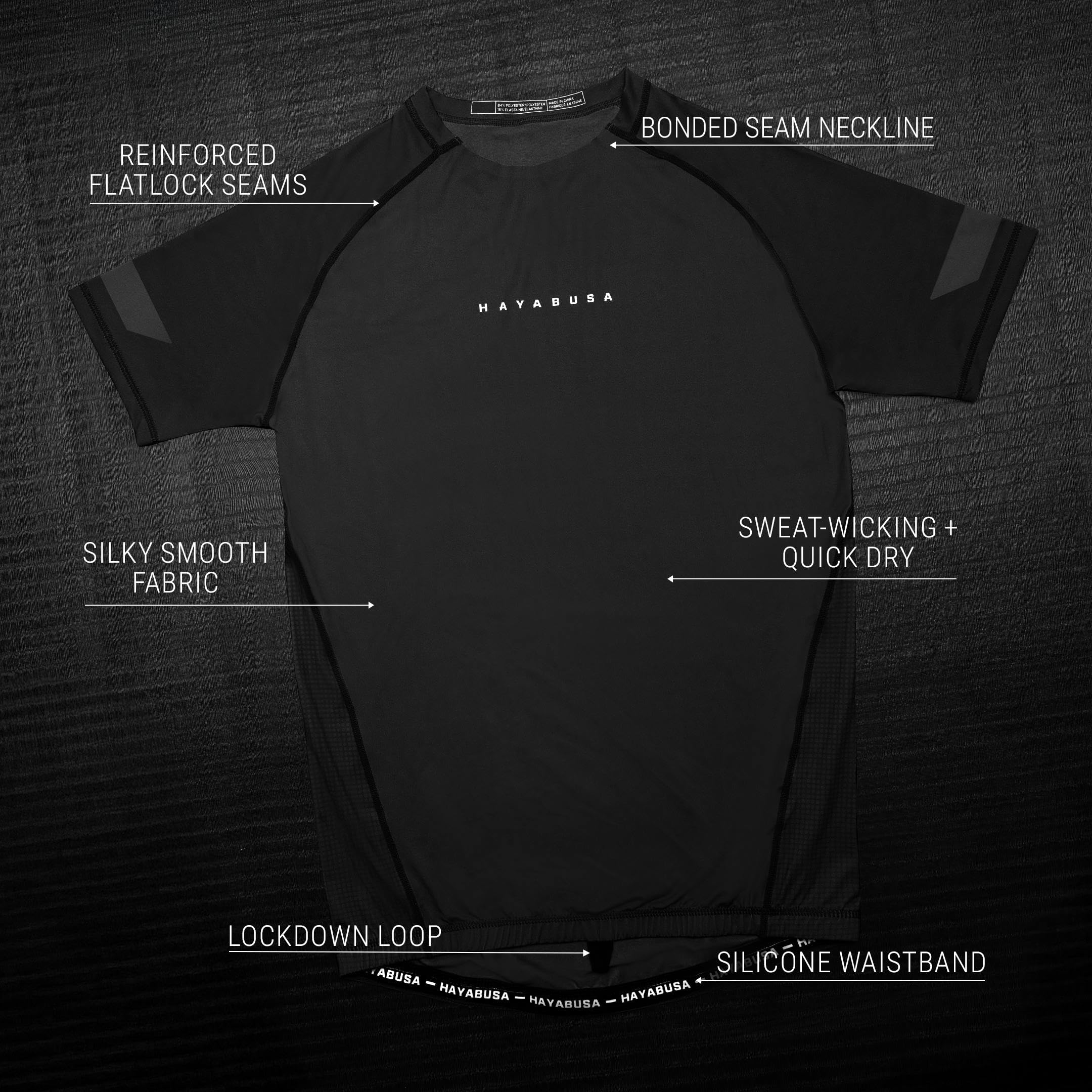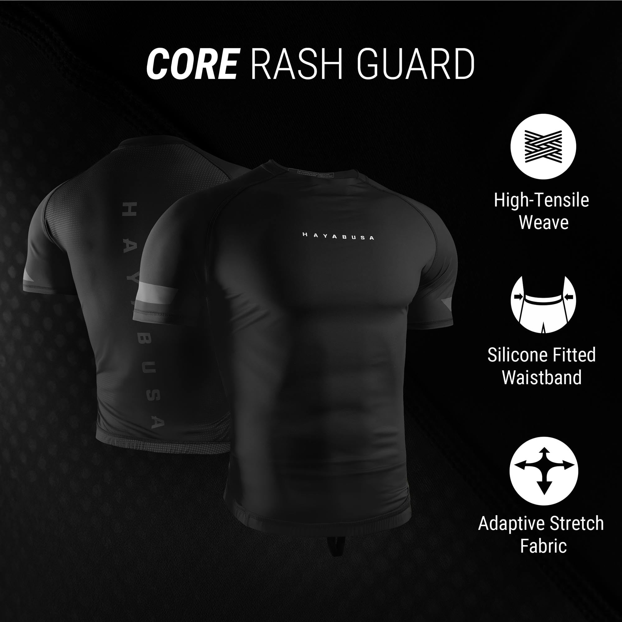 Description The Core Short Sleeve Rash Guard delivers a second-skin fit that flows with every movement. Built from resilient high-tensile fabric with a silicone-fitted waistband to keep everything locked in place through every scramble. Lightweight, sweat-wicking, and quick-drying, it keeps you cool, focused, and ready to push beyond. Designed for those who demand more — the Core Rash Guard is built to move with you and elevate every roll. Features Advanced 200GSM high-tensile weave delivers relentless resilience Silky smooth adaptive stretch fabric combines for a fit that moves with you Silicone fitted waistband comfortably locks the rash guard in place Lockdown loop on the hem anchors your rash guard to your shorts for a secure fit Bonded seam neckline construction delivers frictionless comfort Sweat-wicking quick-dry design conforms to your skin for elite performance Reinforced flatlock stitching fortifies every seam with unparalleled strength