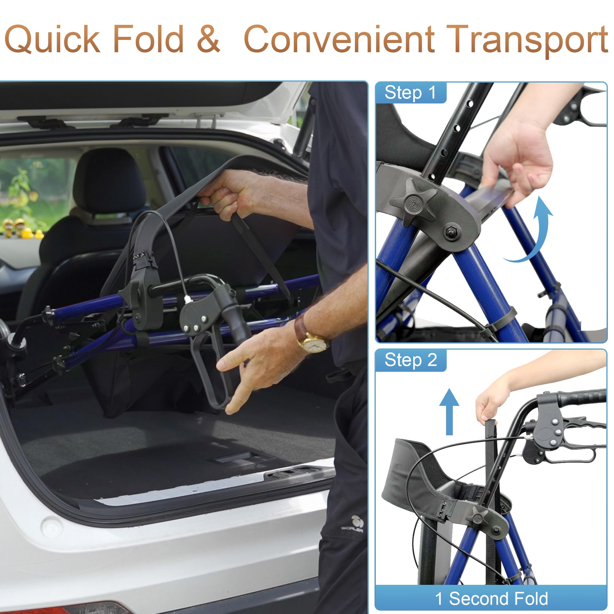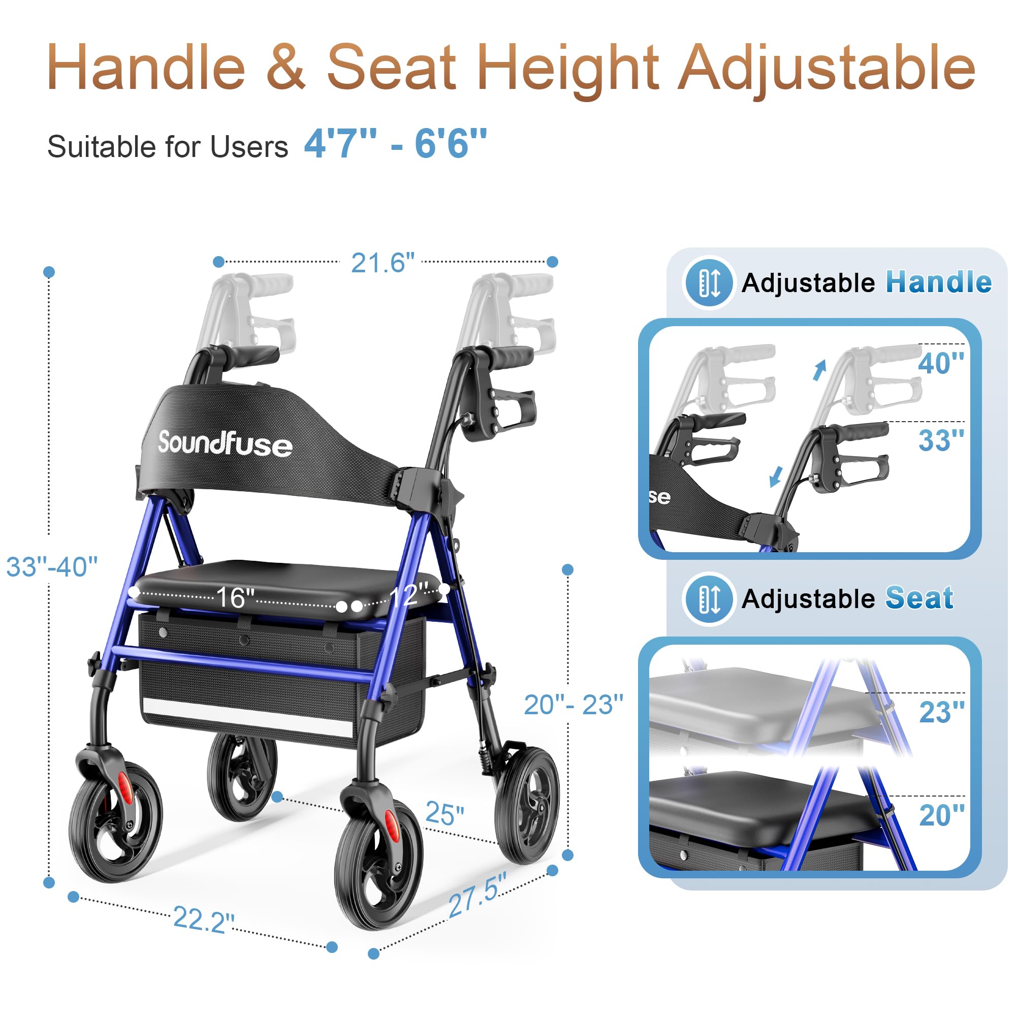 Dual Height Adjustment & Foldable - Our rollator walker suitable for people of various heights (4'7'' -6'6'') via unique dual adjustment design. The seat can be adjusted from 20" to 23" and the handle can be adjusted from 33" to 40", allowing you to find most comfort height. Weighs 20.4 lb, our rolling walker with seat features a quick-fold design, making it easy to transport and store in the car trunk