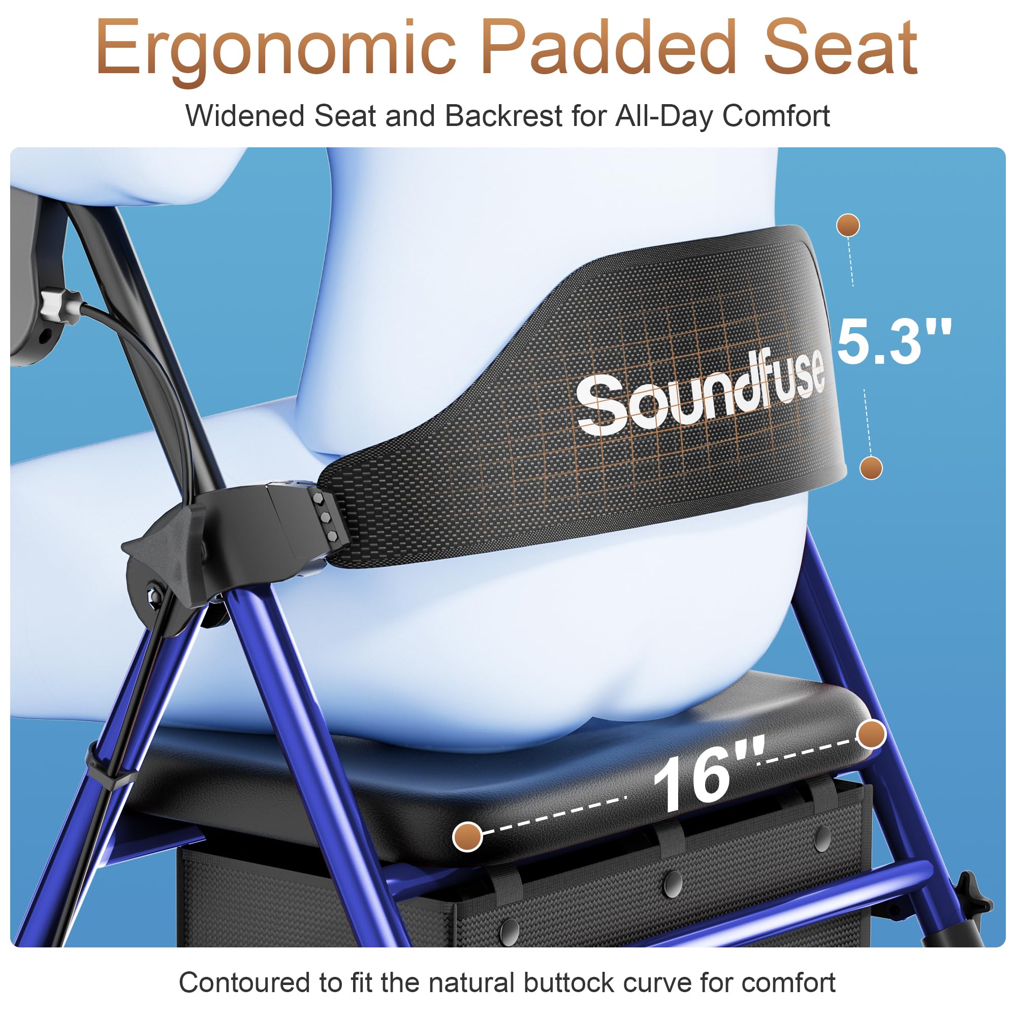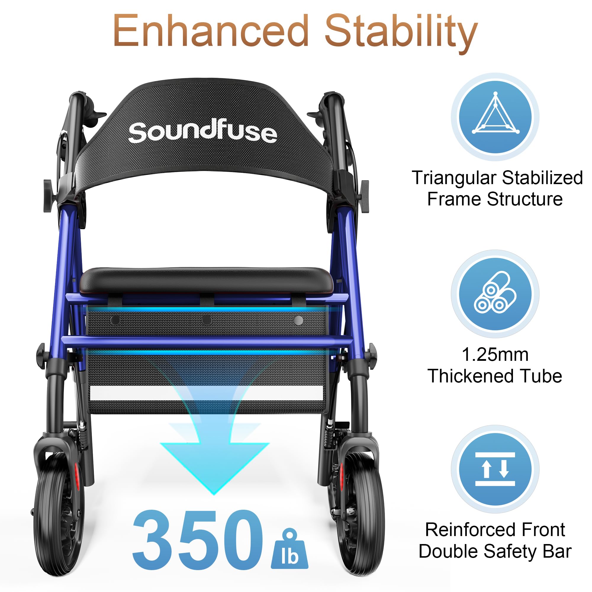 Stable & Durable - Featuring a reinforced triangular frame and double crossbar support, Soundfuse rollator walker with seat boasts a weight capacity of up to 350 lbs. Its thickened tubes ensure enhanced strength and durability, guaranteeing stability with every step
