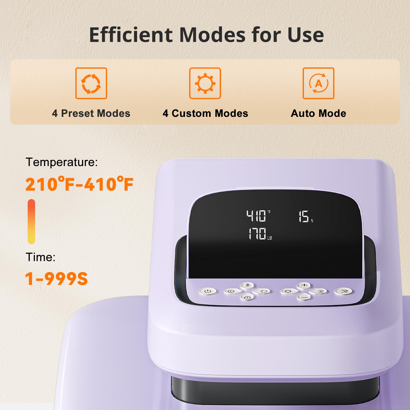 【Auto Heat Press & Hands Free】After setting up the heat press parameters, you only need to press "R" button, HTVRONT heat press will automatically press your design, the machine will buzz when the timer is over to remind you that the press is finished and release the material automatically. In this way, you can work on something else while it’s pressing, greatly improving your work efficiency.