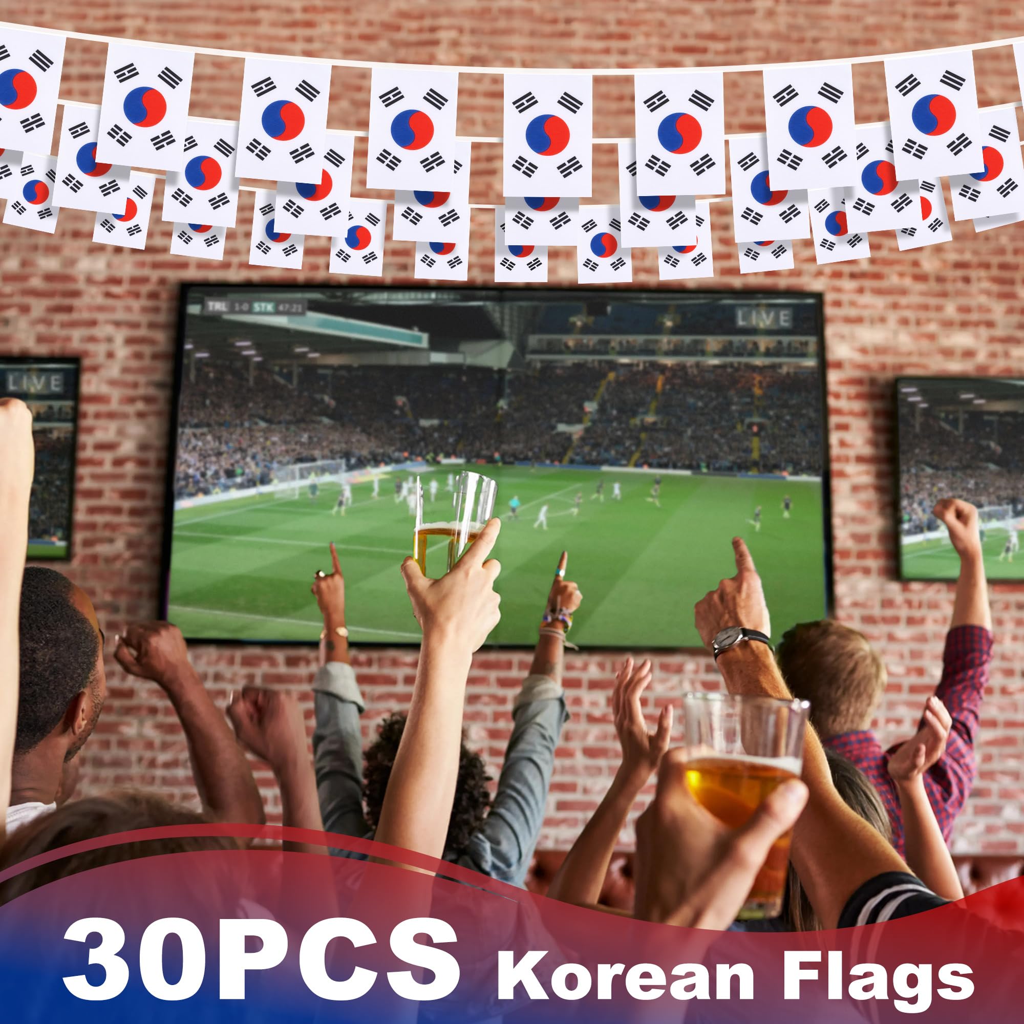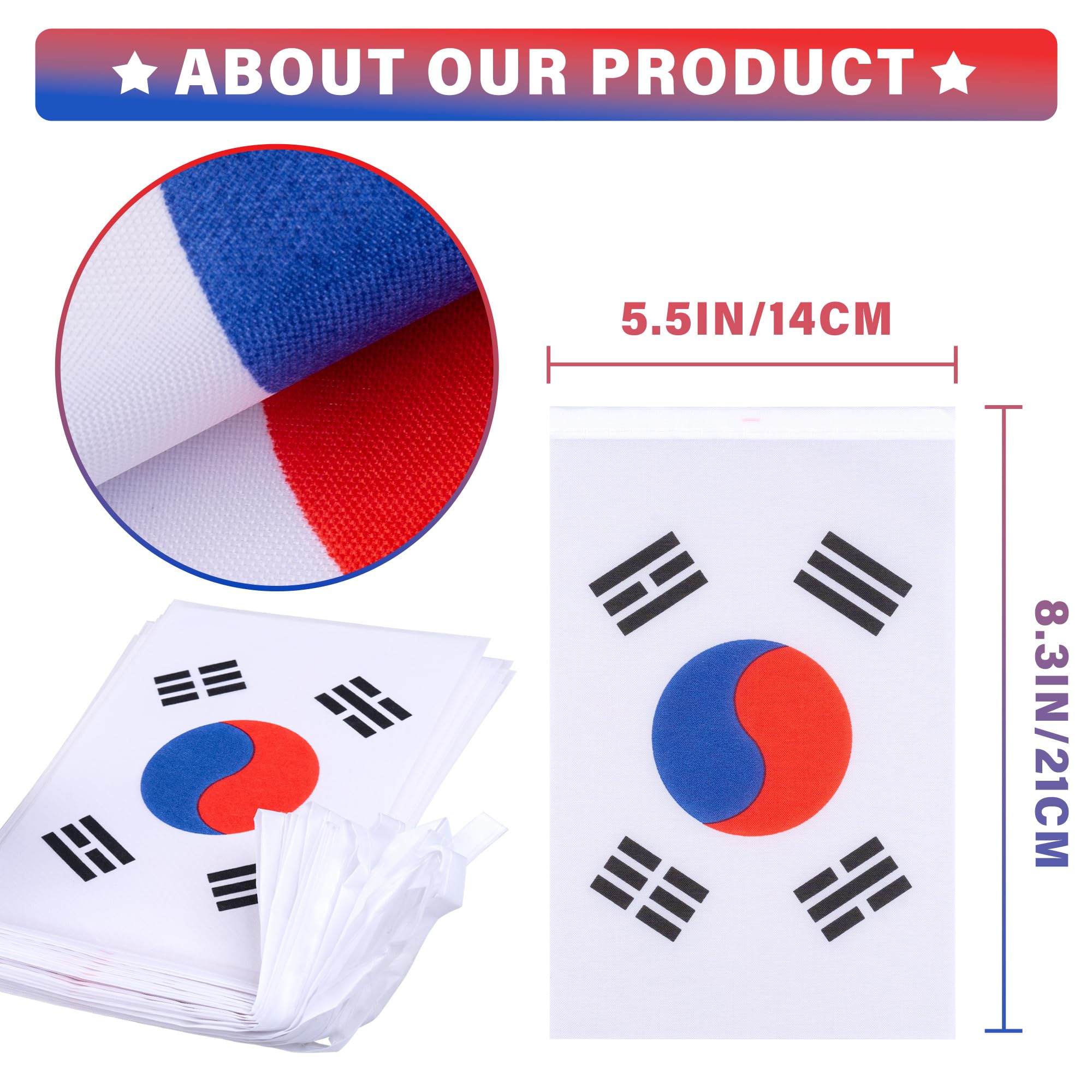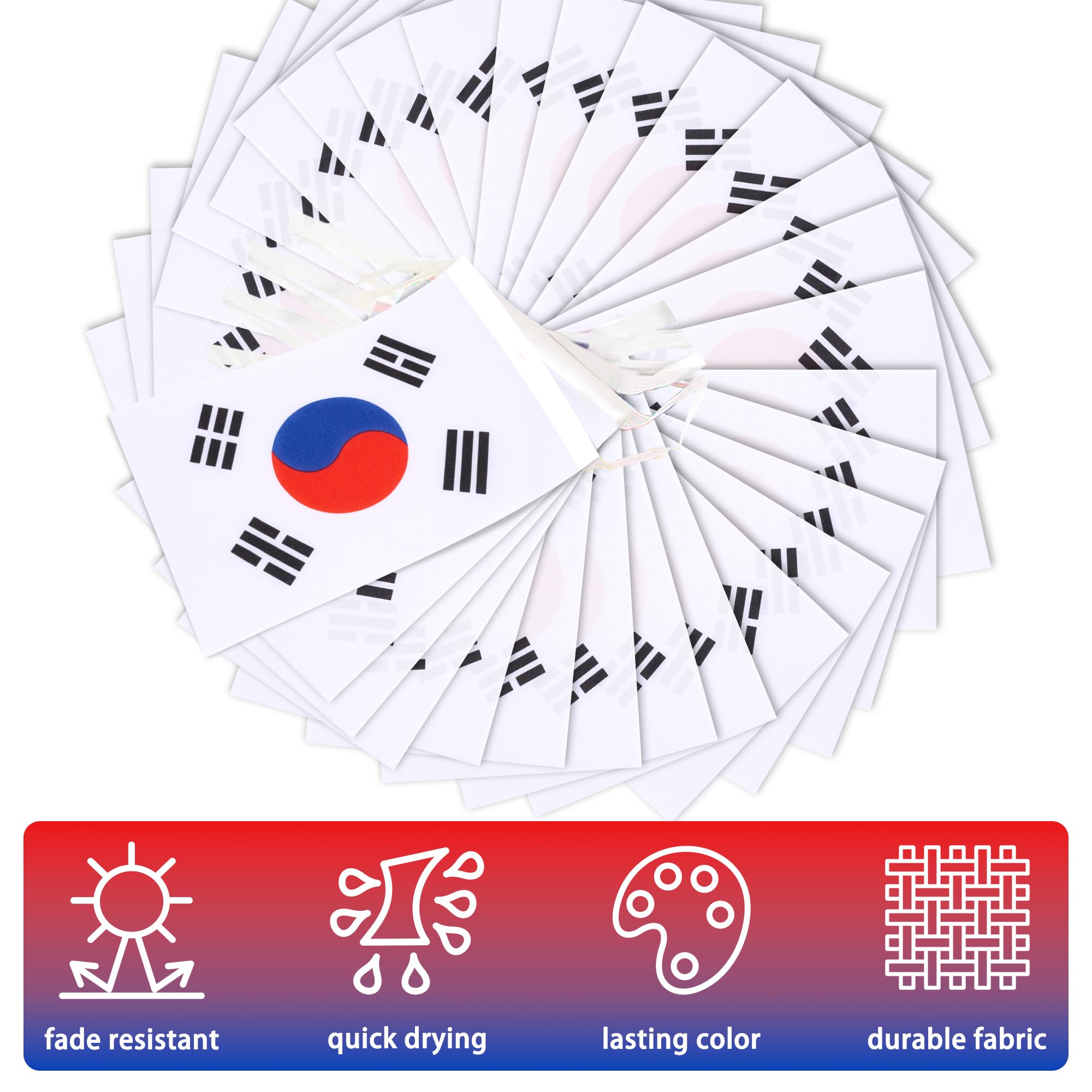 【Specifications】Each string is approximately 33 feet long. Includes 30 pcs Korean flags. Each flag is approximately 5.5 in wide and 8.2 in long.