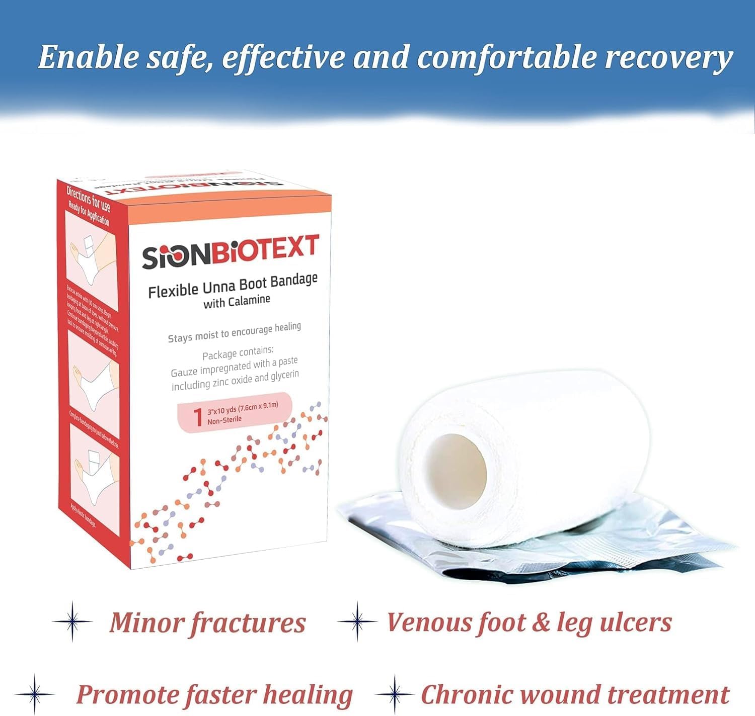 Unna Boot with Zinc Oxide 3 Inch x 30 Feet - Non-Sterile by Sion Biotext is a high-grade gauze bandage that has been evenly impregnated with a non-hardening paste of zinc oxide to provide venous ulcer compression therapy. The zinc promotes healing within wound sites, making it useful for burns and ulcers. The non-raveling gauze is uniformly coated so that it is easy to handle and mold to the limb. Unna Boots may be worn up to 7 days, without changing, if medical conditions permit. These Bandages are embedded with zinc oxide, which helps relieve skin irritation and keep the wound area stay moist. The Unna boot bandages are latex free to reduce the risk of skin irritation. Sion Biotext Unna Boot Bandage used for the treatment of venous insufficiency ulcers, (especially with moist desquamation), lymphatic edema, Thrombophlebitis, strains, sprains, and dislocations.