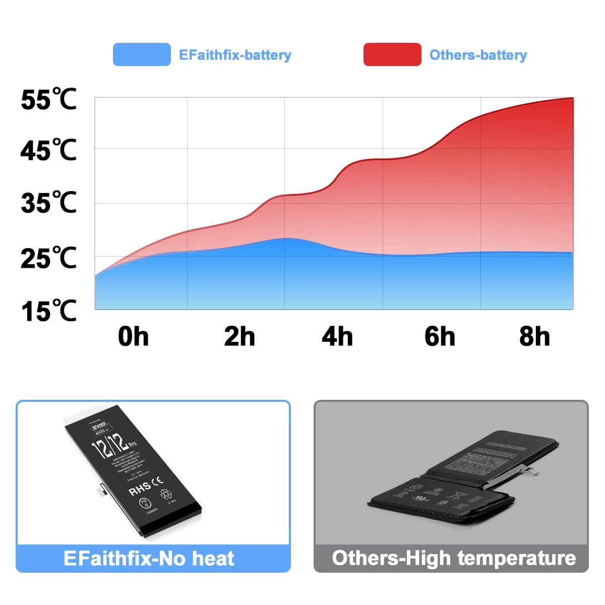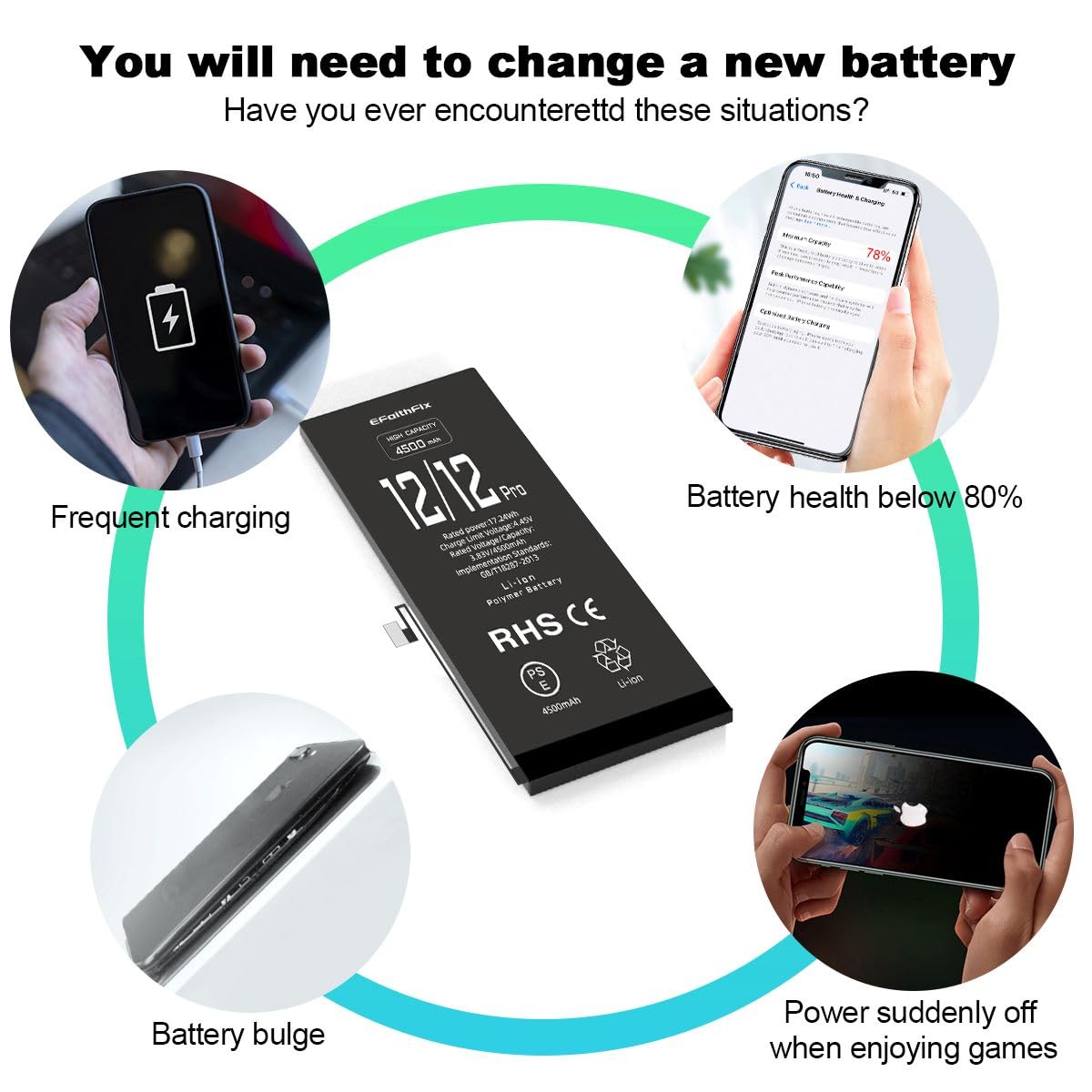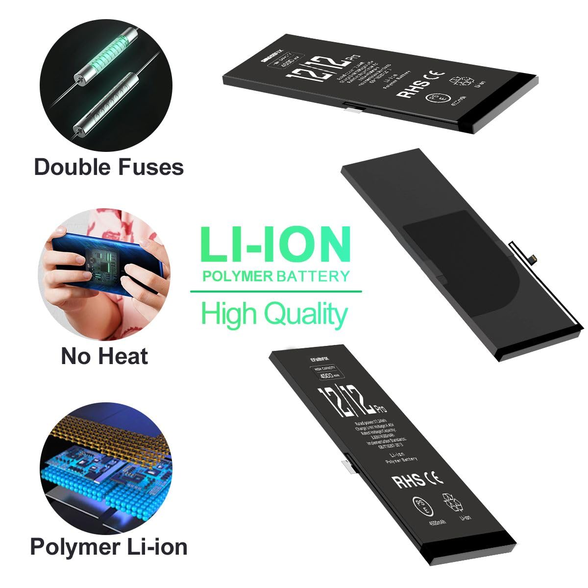 👑【Safe and Efficient】 Grade A+ iPhone 12/12 PRO cells ensure high-speed and efficient charging. Multiple-protection for safer operation for both user and devices, build-in microchip to prevent over-charging, over-discharging and over-heating. Meanwhile, the iPhone 12/12 PRO batteries are tested by third party security, such as FCC, CE, ISO9001/14001 and ROHS Certificated. You can buy it with confidence.