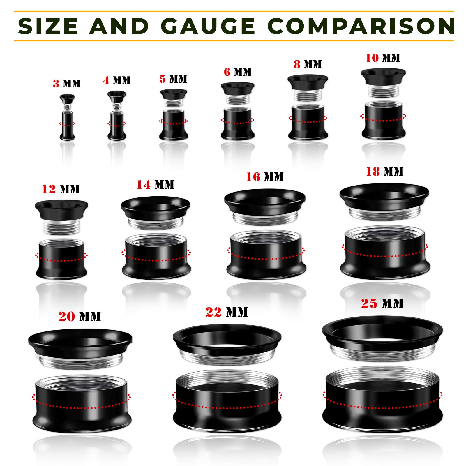Description QUALITY STAINLESS STEEL Surgical steel is used in our Double Flared Tunnel Plugs; it’s implant grade and biologically compatible which means it won’t irritate. Surgical steel is corrosion resistant and easy to clean. ANODIZED COATING This coating applied to these Ear Tunnels Gauges not only helps reduce the chance of infection, but it provides a durable color that is resistant to fade or tarnish. UNISEX AND UNIQUE TO US Anyone can wear these Ear Plugs Tunnels, and they suit any occasion. They’re a great all-around choice. FRONT ATTACHMENT Because you push these Ear Tunnels Screw in from the back and screw in at the front it makes them very easy to use. The threads are not stripped out. YOU RECEIVE Black Tunnels Gauges Ears. 14 gauge choices ;8g 1/8"(3mm), 6g 5/32"(4mm), 4g 3/16"(5mm), 2g 1/4"(6mm), 0g 5/16"(8mm), 00g 3/8"(10mm), 1/2 inch Gauge (12mm), 9/16 inch Gauge (14mm), 5/8 inch Gauge (16mm), 11/16 inch Gauge (18mm), 3/4 inch Gauge (19mm), 7/8 inch Gauge (22mm), 7/8 inch Gauge (22mm) and 1 inch Gauge (25mm), please choose one.