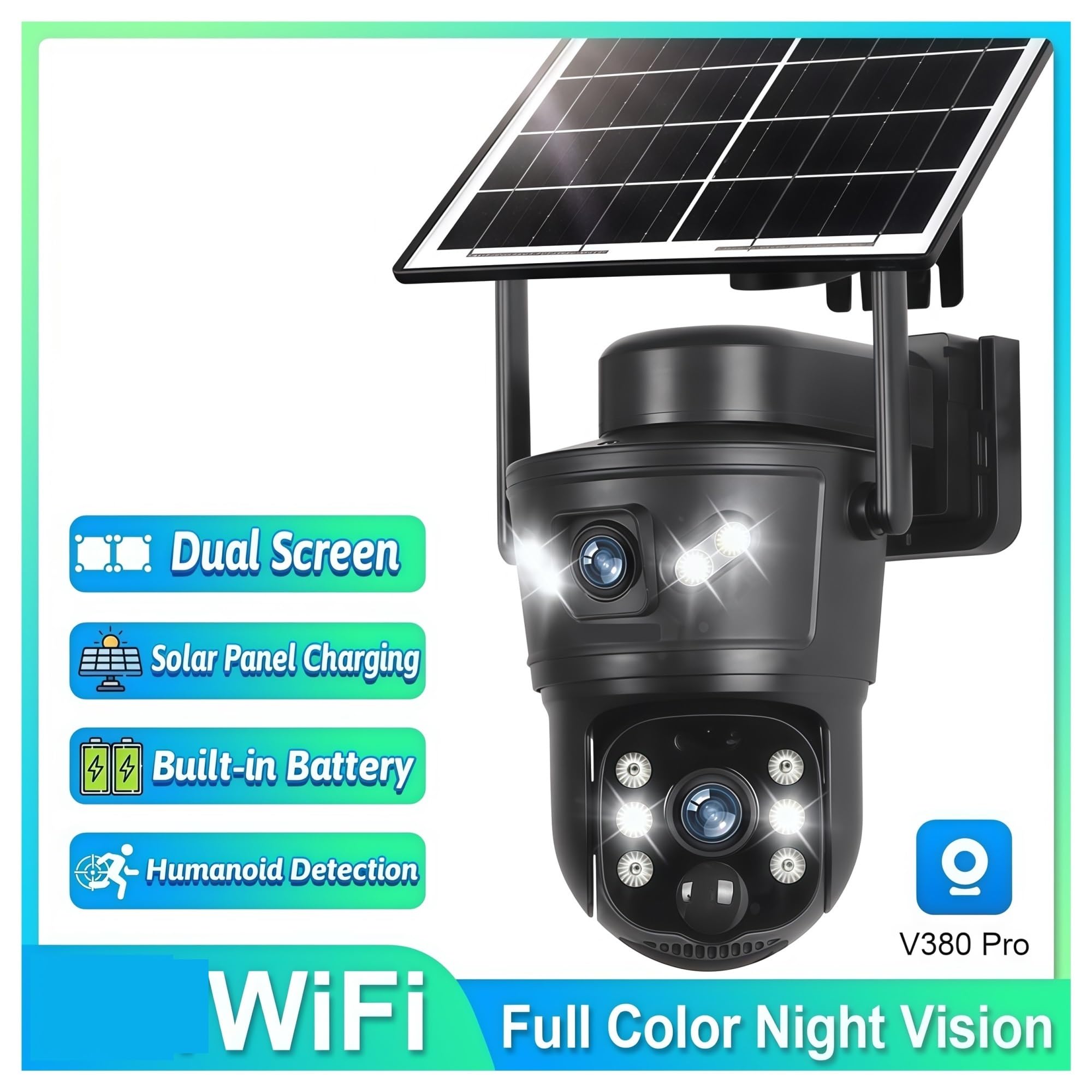 Features: 1. 4K dual lens dual-screen wifi solar powered battery PTZ camera 2. Pan&TiltPan 355 degreeTilt 100 degree 3 8 watt solar panel with 1.8m extension cord,built-in 10800mAh batteries 4. Two-way voice intercom 5. Cloud storage and TF card storage maximum 128G(without TF card) 6. Wifi or 4g sim are two purchase options, not at the same time, please choose one of them., remote viewing/playback via APP (V380 Pro) 7. PIR +Ai humanoid detection alarm and video recording 8. Arbitrary arming time can be set and alarm sound can be set 9. 3.6mm +3.6mm lens,built-in infrared light + white light, IR distance 20 meters 10.Support humanoid automatic tracking 11. Waterproof grade IP66 Dual Screen Dual Lens Solar Linkage Camera 4K 8MP=4MP Lens + 4MP Lens Works even no WiFi No need to spend time laying network 2.4G WiFi Camera Version Three Working Modes Available This solar camera has three working modes.We suggest you low power mode. PIR Humanoid DetectionInformation Alarm & Sound Alarm The mobile app will display alarm information prompts Automatic Tracking Enable humanoid detection and tracking function on the APP Pre set position settings You can set 6 preset positions clickto return to the set position. Full Color Night Vision &White light automatic mode Normally in black and white mode when the camera detectsa moving object it will automatically turn on the white lightand switch to full-color night vision mode. Customize Alarm Area Customize the mobile detection alarm area andalarm time period through the mobile app. Two Way Audio Real Time Intercom Listen and talk from anywhere through the application Solar Panel Charging With 1.3m Extension Cord Connect the camera to the solar panel,and it willget uninterrupted power all day and all night. PTZ Rotation The camera can be rotated 355° pan and 100° tilt. You can control it through the app. Replay The Video At Any Time The solar camera support SD card and cloud storage. Multi-Users Remote Access Through the mobile app, it can be shared with other users. IP66 Waterproof Waterproof, Dustproof & UVResistant Internal Storage : None Audio Output : 1CH BNC Supported Operating Systems : No Supported Mobile Systems : iOS,Android Viewing Angle : 360° Lens (mm) : 3.6mm Connectivity : WiFi Sensor Size : 1/2.7" Sensor : CMOS Focal Length : 2.8mm Installation : Side,Ceiling,Normal Technology : INFRARed,Pan / Tilt / Zoom Alarm Type : Local Alarm APP : V380 Pro High-efficiency Solar Panel : Built In Large Capacity Battery Humanoid Detection Alarm : Instant Alert & Notification Push Human Automatic Tracking : automatically rotate as the person moves. Full Color Night Vision : black and white mode PAN & TILT : operated remotely through the app IP66 Waterproof : sunscreen and dustproof Two-WayVoice Intercom : Activity Alarm Area 2.4G WiFi Camera Version Dual Screen : Dual Lens Solar Linkage Different Installation Methods : More Users Two Storage Modes : low-power mode Adaptive Power Mode : Pre set position settings outdoor surveillance camera : wifi wifi security cameras : Wifi security camera camera security wifi : wifi surveillance cameras wifi camera : wi fi surveillance camera home surveillance cameras : home surveillance cameras telecamera sorveglianza wifi : solar camera security camera : solar cameras wifi outdoor Cctv camera : solar outdoor surveillance camera outdoor solar camera : outdoor solar camera camera wifi outdoor : house surveillance cameras telecamere wifi esterna : Surveillance camera Hello, welcome to my store. Wishing you a pleasant shopping experience!