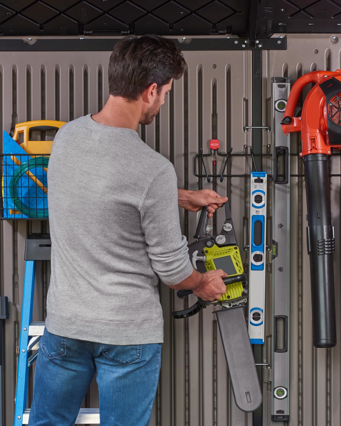 CUSTOMIZE TO YOUR NEEDS: Use Rubbermaid wall anchors to add pegboard, shelves, utility hooks, sports racks, and other accessories to the inside of the shed. Each wall panel is strong enough to hold up to 75 lbs, using Rubbermaid shed accessories.