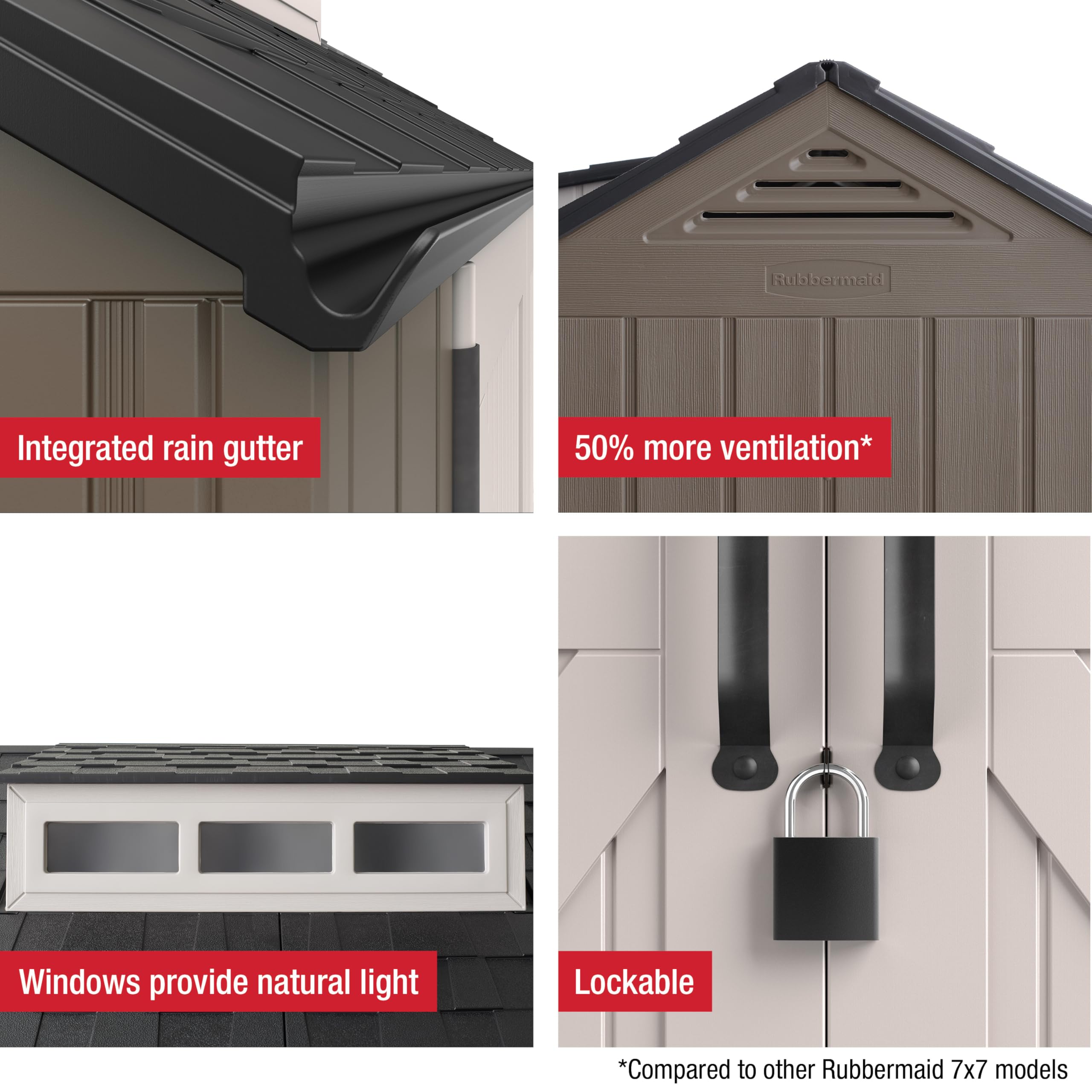 The 7-ft. x 10.5-ft. Storage Shed is made of durable resin that won't rust or rot, providing weather resistance all year long. This storage shed is faster and easier to assemble than the previous 7-ft. x 10.5-ft. model. This storage shed stores large lawn care essentials, sporting equipment, garden tools, bicycles and more.