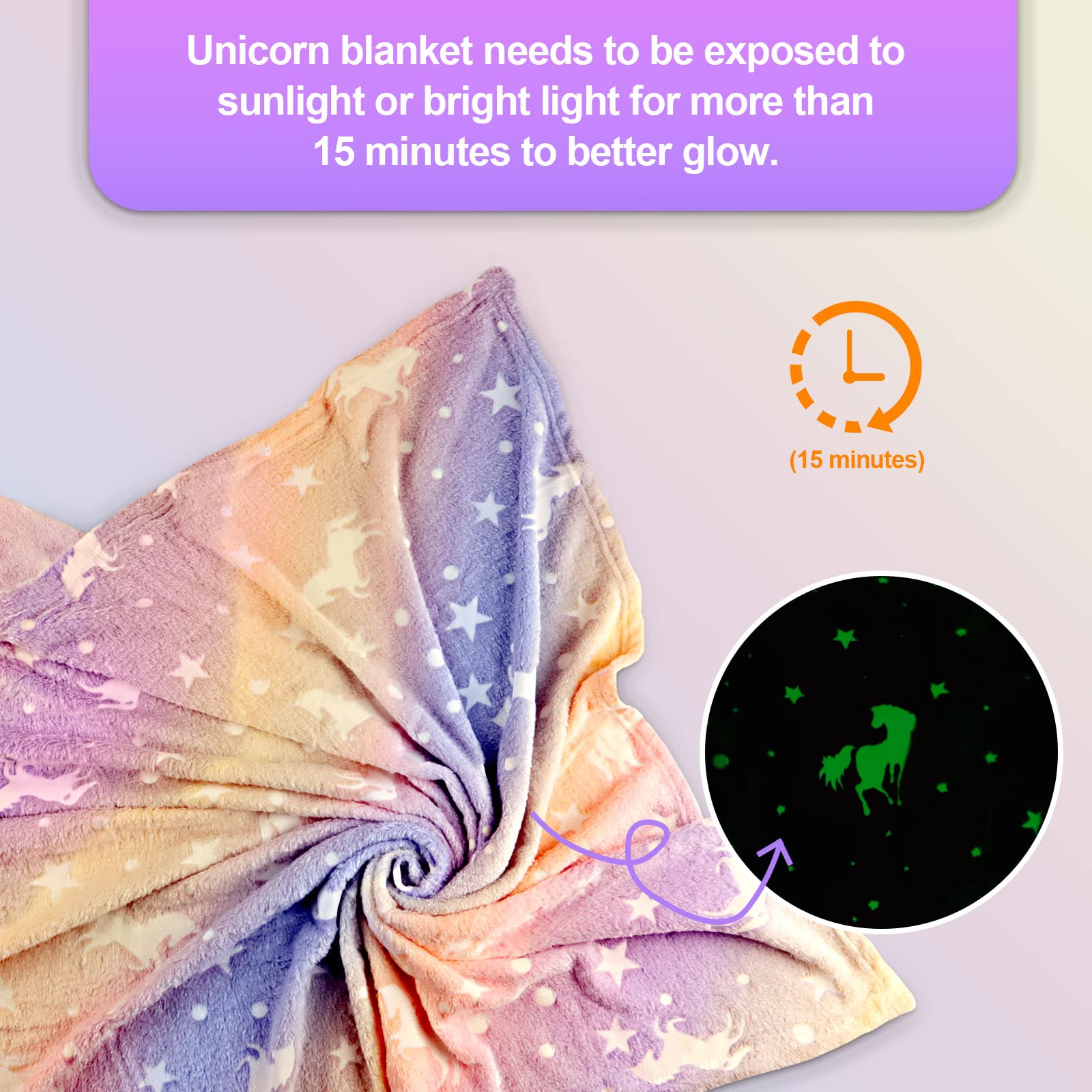 Glows in the Dark Blanket: Our unicorn blanket glows in the dark, simply expose the unicorn blanket to bright light for 15 minutes, then turn off the light and magical things will happen.