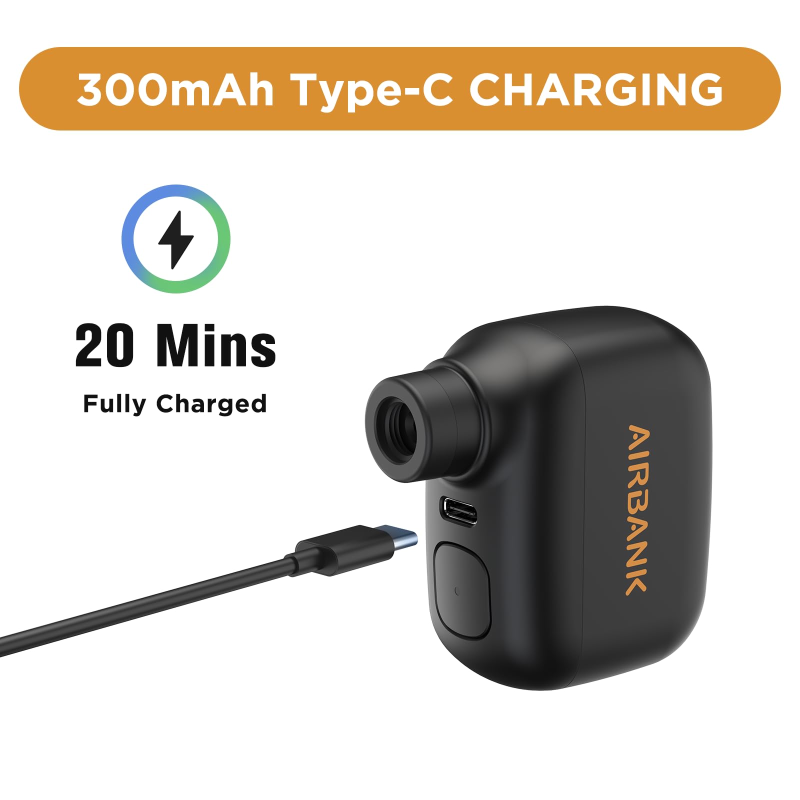 【Fast Charging】 : AIRBANK portable bike pump only takes 20 minutes to fully charge with a Type-C USB Charging cable. It’s perfect for unexpected cycling. All you need is charging it while packing your other stuff. When finished packing, the tiny bike pump is also fully charged